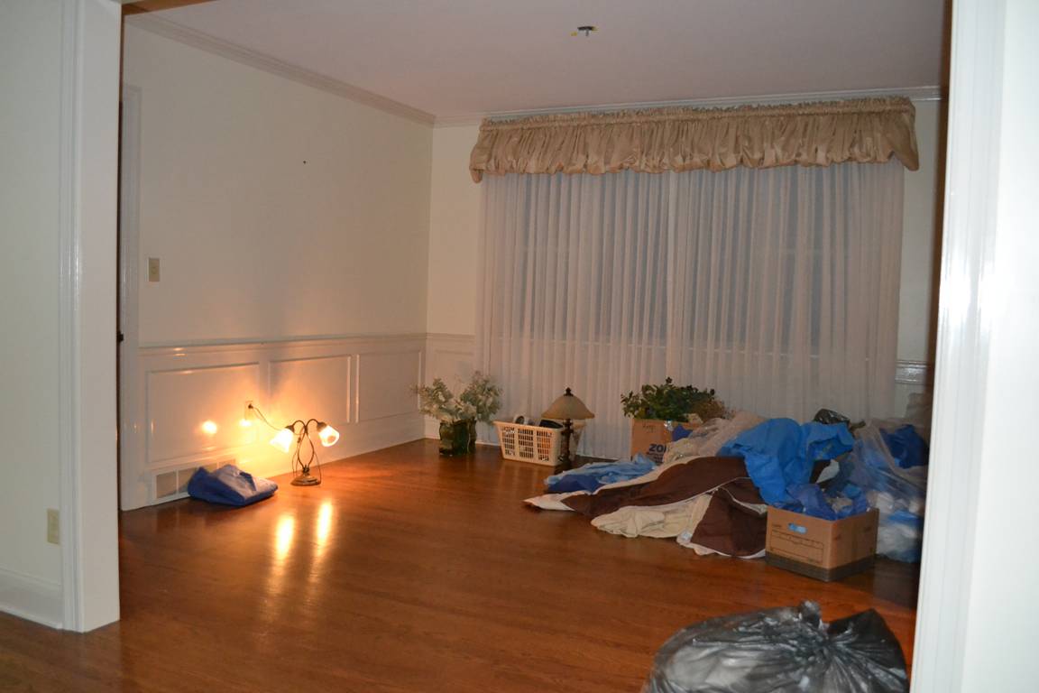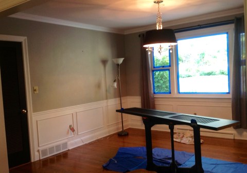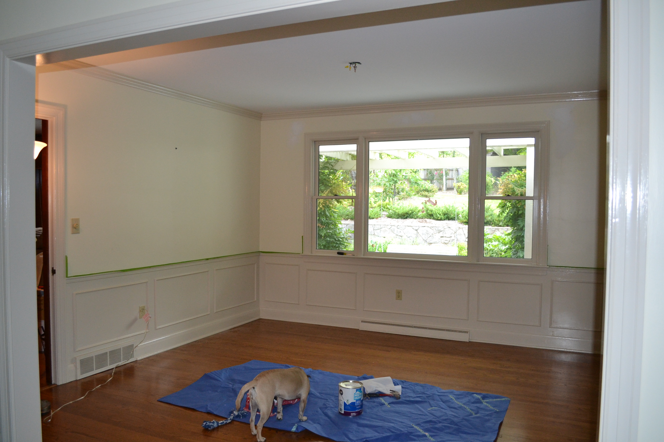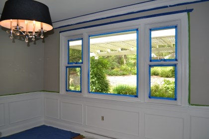 The room is about 13×13. It has amazing wainscoting below the chair rail and crown moulding on each wall. It’s hard to distinguish these beautiful wood accents because they slightly blend into the wall. My goal is to make these upgraded features really pop. First and foremost I removed the valance and sheers from the windows to really open up the space.