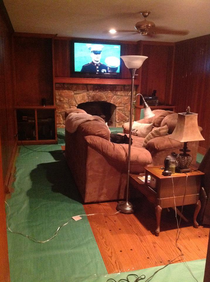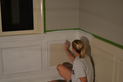 A few Thursday’s ago after work I decided to grow a pair and just do it. I taped-off the crown moulding, floor, and brick fireplace. We pushed all the furniture to the middle of the room and secured paper to the floor.