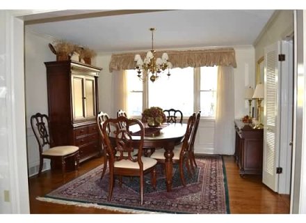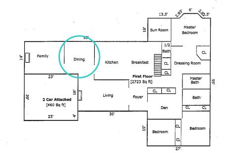 My first project is the dining room. I have no specific plan to number/rank each room I want to tackle, but somehow the dining room became lucky #1 on the list. To give you an idea of the first floor layout of the new house, here is a mock-up (not to scale) floor plan. Said dining room is circled in blue.