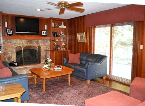 Slacker=Me. Yep. I have officially been lazy the past month or so. Not lazy as in I didn’t do any projects, lazy as in I didn’t feel like blogging about them. I completed several projects over the holidays. Most of the DIY’ing was in preparation for the ginormous Open House we threw the Sunday before Christmas. I invited 100 people thinking “it’s Christmas, people will be away” but we ended up having a total of somewhere around 75 guests. We ‘did it up right’ with a plethera of food catered by my brother and a stocked bar, manned by Men in Black Bartending. It was a smashing good time. But anyhow…before the big shindig took place we gave the den a big makeover by painting the paneling, buying a new sofa and love seat, and adding a cowhide rug (found here). While we waited for the two leather club chairs to be delivered I decided to paint the stone on the fireplace. I lived with the fireplace for a few weeks, but the orange-ish hue of the stone was too much of an eyesore in this newly updated room.