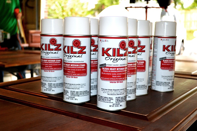 I worked diligently Monday, Wednesday, Thursday and Friday when I got home from work. (Tuesday, not so much. I reserved Tuesday for a well deserved happy hour with my girls.) The oil primer that I applied on Sunday (via roller) had 24 hours to properly dry so Monday I began working on the fronts. Because I can be a tad lazy every now and then, I opted for Kiltz oil-primer in a spray can. I wanted the smoothest finish on the ‘show side’ and thought this would be the best/fastest/easiest way to achieve it. (Lord knows I wasn’t about to put oil-primer in my brand new, never been used, paint sprayer). It ended up costing me about $65 in spray primer, but way worth it in the long run.