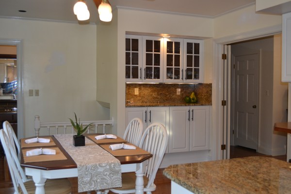 Are you as speechless as I am???!! The granite completely pops against the cream cabinets. It becomes it’s own show piece. The drawer pulls (or ‘jewelry’ as my mom calls them) completely pop off the doors and add a little contemporary zing to this somewhat traditional kitchen. Did you notice what I did to the table? I left the top natural and only painted the legs. I may change up the chairs with some black paint, the jury’s still out on that one. What do you think???