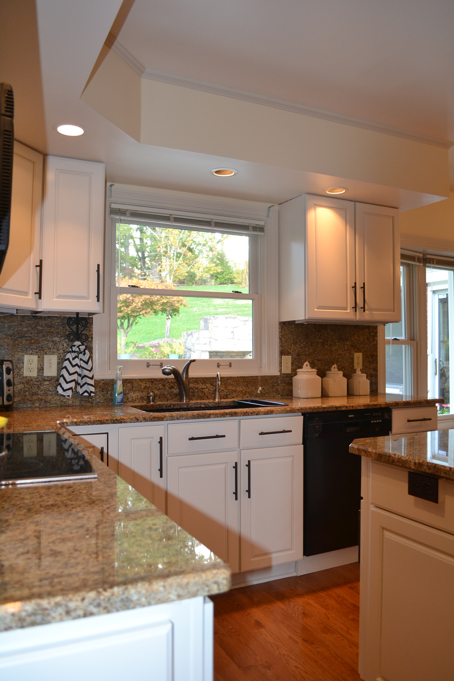 The vanity top: keeping the tan granite (against my will), replacing the cream under mount sink with a white sink.