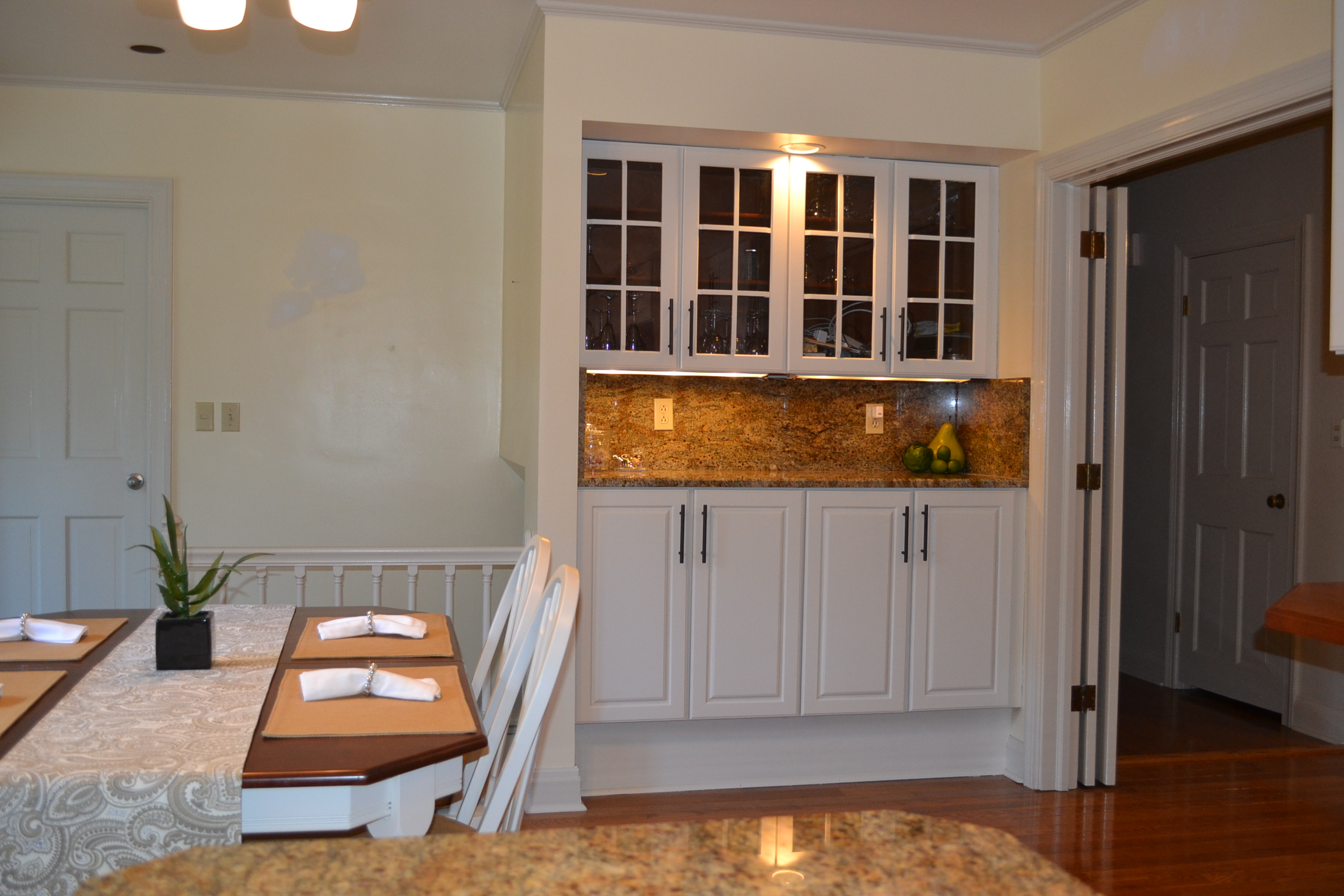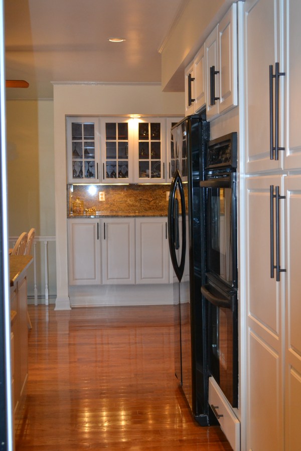 Needless to say I am totally smitten kittens on this project!!! I just sat in the kitchen and stared at it for at least two hours after it was complete. Ryan and I are both excited about how a few coats of paint, 10 days of sweat equity, and some new hardware can transform a dark cherry kitchen into a contemporary, open, and inviting space! Next step? Tackle the lighting and decide on a paint color (did you notice all the patch holes?)!! I’d like to remove the fan and add a chandelier over the table and add some lighting over the island! As far as paint, I have absolutely no idea…..