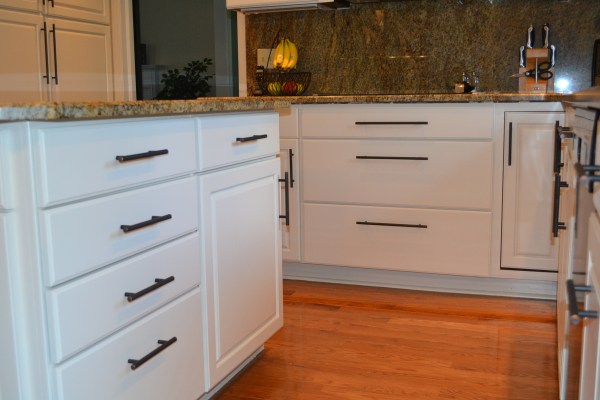 In the end Ryan and I both decided we wanted something modern and contemporary. We knew ORB would be a nice contrast to the cream cabinets and would play off the dark flecks in the granite, so the Amerock Oil Rubbed Bronze Cabinet Bar Pulls became the winner!