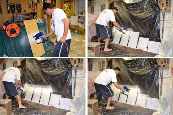 Yeah, you could say I was just a little pumped to finally start spraying those cabinet doors and drawers! We ended up preparing two spray stations since there were so many doors and drawers. The garage held the majority of the pieces while the overflow went into the basement shop area. We got in a little practice on some scrap wood, then went to town on the backsides of the doors. We applied thin coats of paint so it wouldn’t run. We had to keep the sprayer back a good 18″ or so to achieve this (hence why so much paint was used/wasted).