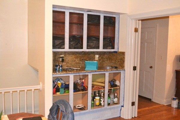 The spray-can primer was killer. It only took me about 45 mins to spray the fronts of all the doors. If I wasn’t so cheap thitfy, I would’ve sprung another $65 to do the back side. I forgot to snap a pic of the doors all primed and pretty, so this picture of the primed and wrapped drawers will have to suffice.