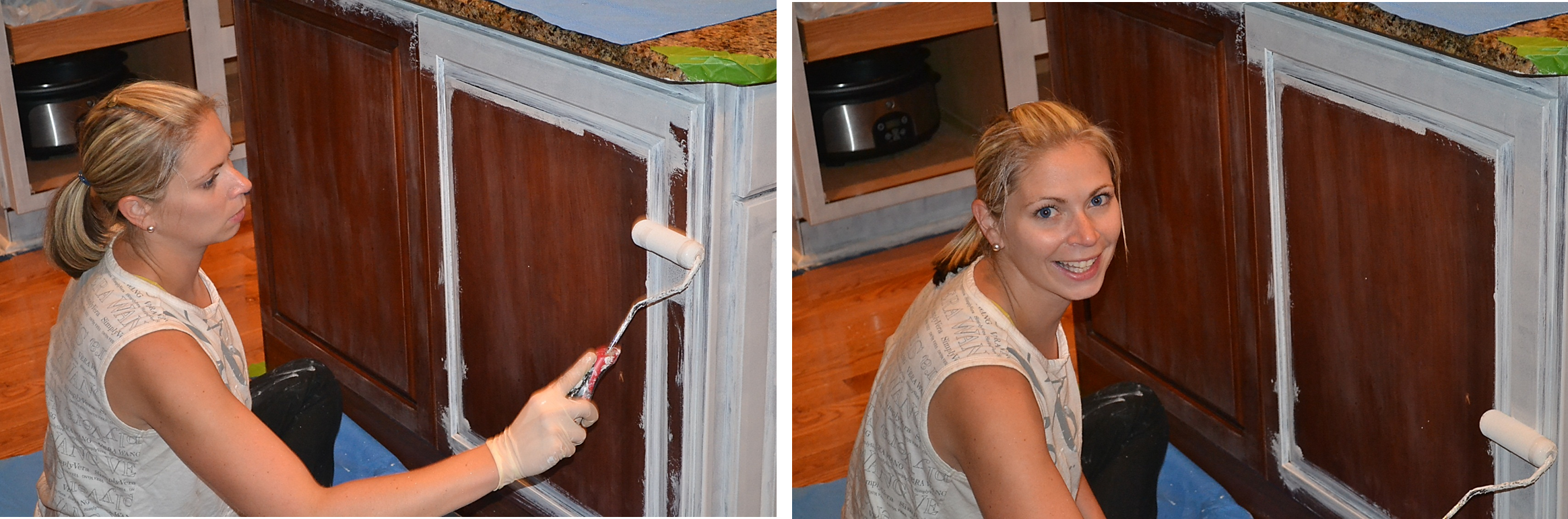 I started on the cabinet frames that evening after work. I used my handy 2″ cut-in brush from Sherwin Williams (I’m sure you’ve heard me go on before about how great that brush is, so I will spare you) and a brand new 4″ smooth foam roller. It took right around 4 hour to apply the first coat of paint. About 3 hours longer than anticipated, again…haha.