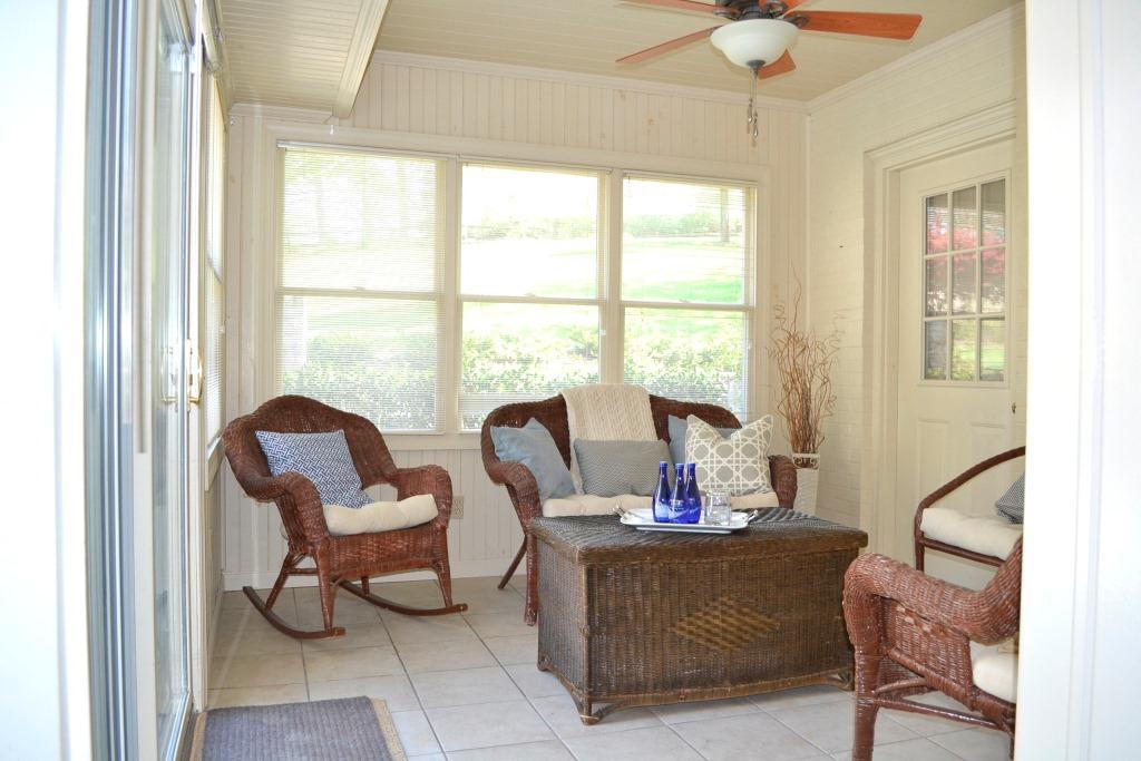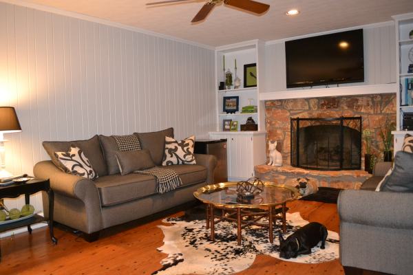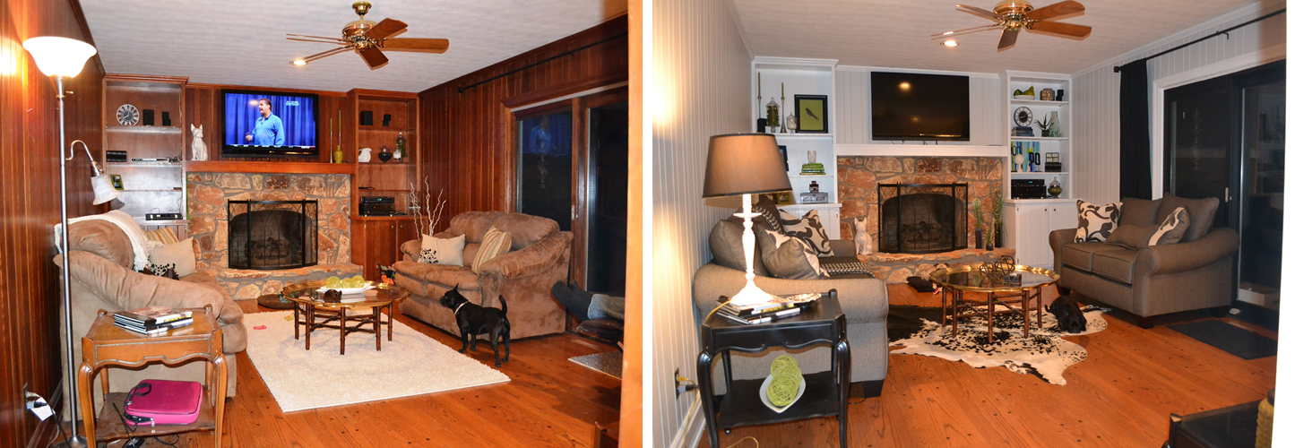 I agonized over painting that solid wood paneling night after night. I even slept on it for well over 2 months. I finally came to the realization that if I wanted this room to become ‘me’ I needed to suck it up and paint the damn wood. This cave-like room is located off our dining room and leads outside to the patio. It’s where we watch TV and relax every night. It’s where the boys gather to watch the game. It’s where the puppy’s sleep when we’re away.