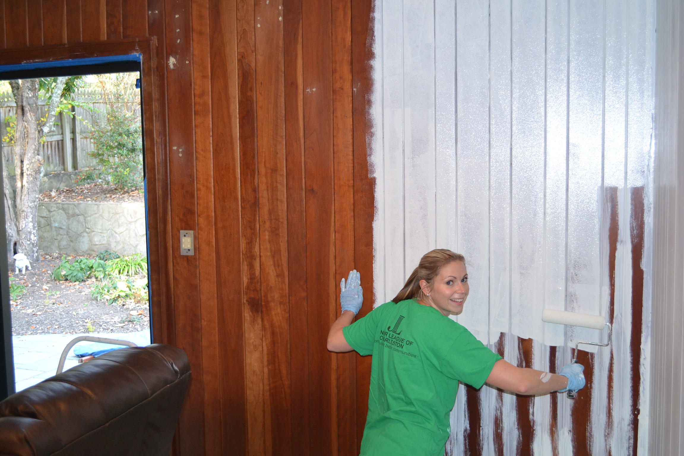 Supplies needed: Paint tray and liner, unused 3/4″ nap roller, and old paint brush….that’s it! It was just like painting a wall, except it was really thick. You apply the pink goop with a roller or spackle knife and that’s it.