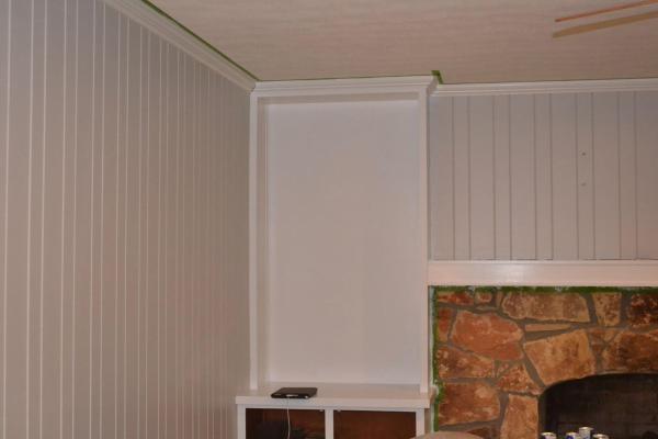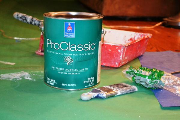I broke out the enamel paint (in bright white) and started my first coat on the trim and built-ins. Because I had such good luck with the Sherwin Williams Acrylic Enamel paint in the kitchen, I decided to spring an extra twenty dollars a gallon and use it for the built-in’s and trim in the den. This paint is regularly priced $63.99…I got it on sale for $45. I didn’t necessarily need to use enamel paint on the trim, but because the built-in’s were gonna be enamel I wanted all the wood trim to match.