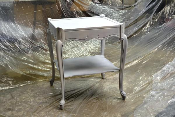 I cleaned both pieced and de-glossed them. I didn’t bother to sand the surface because I used oil-based primer and because these tables are only temporary until I find something I really like. After a coat of primer they started to transform.