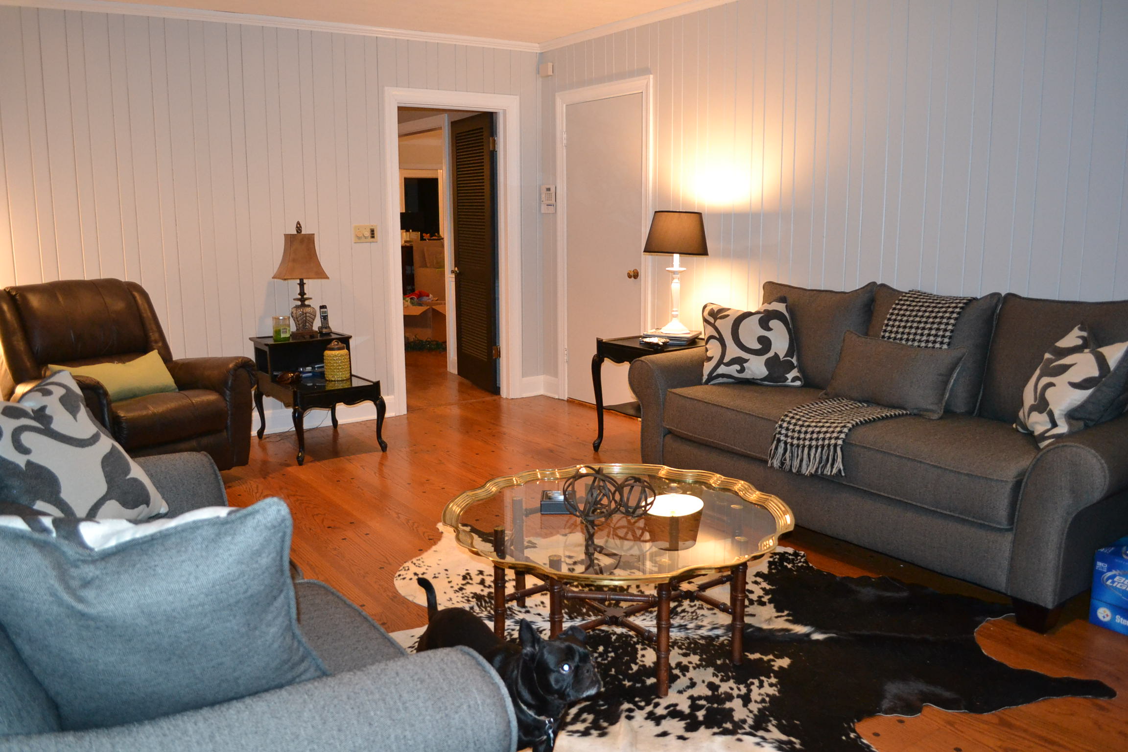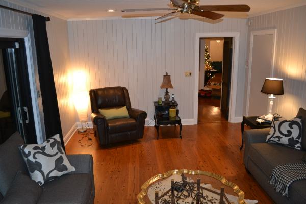 Before we started this 3-day-wood-paneling-extravaganza we ordered some new furniture which you may have noticed. Yep,those tan microfiber-hand-me-down sofa and loveseat are gonzo. I craigslisted them and we bought a new herringbone sofa and loveseat. I know the rule now-a-days is that your furniture isn’t suppose to match, but I just couldn’t do it in this room. With the layout of the room it would look odd if they were different, in my opinion. So without further ado….our new den sans cherry paneling: