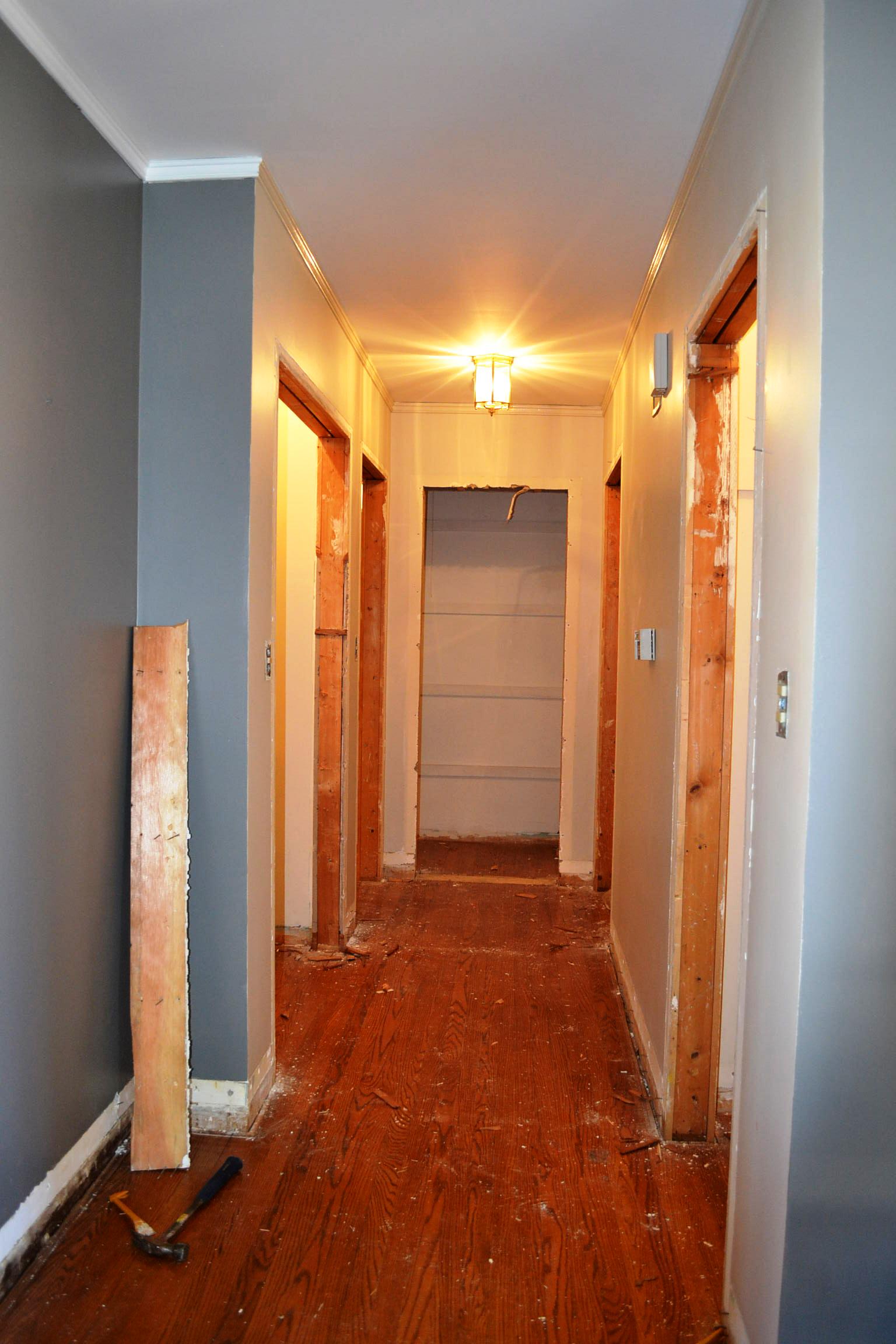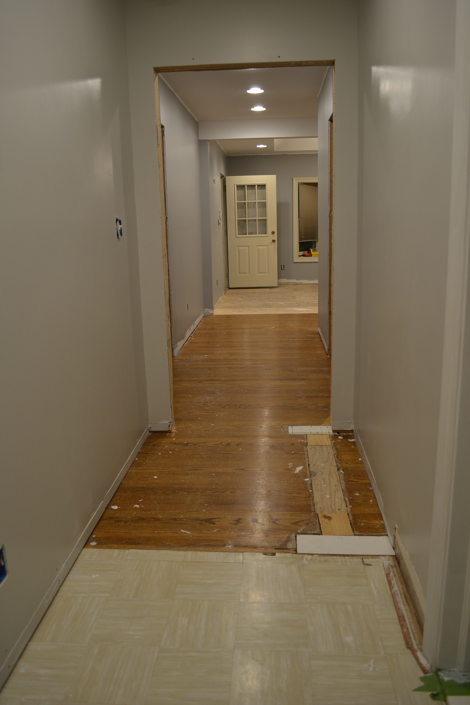 Yep, they’re in! Our twinkle toes are now touching new hardwoods and marble. I can officially say I won the battle-of-the-flooring. Ryan wanted carpet. I wanted hardwood. He likes a soft feeling under his toes, I like the easiest way to clean up dog vomit. Not that dog vomit happens a lot, but it does happen and it’s much easier to clean wood floor (in the dark, at 3am) then carpet. But anywhoo… This is what we were working with in the hall/bedroom.