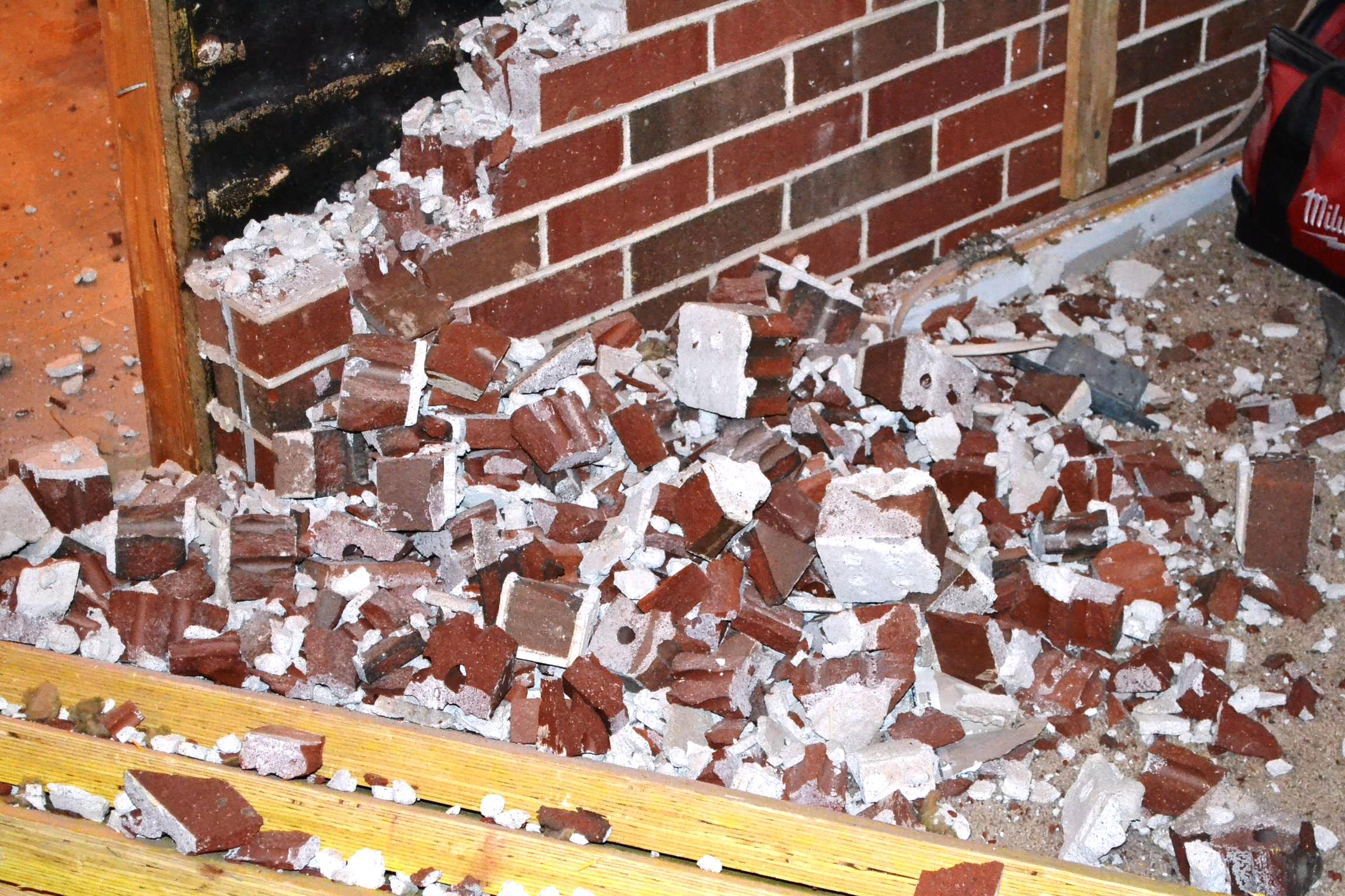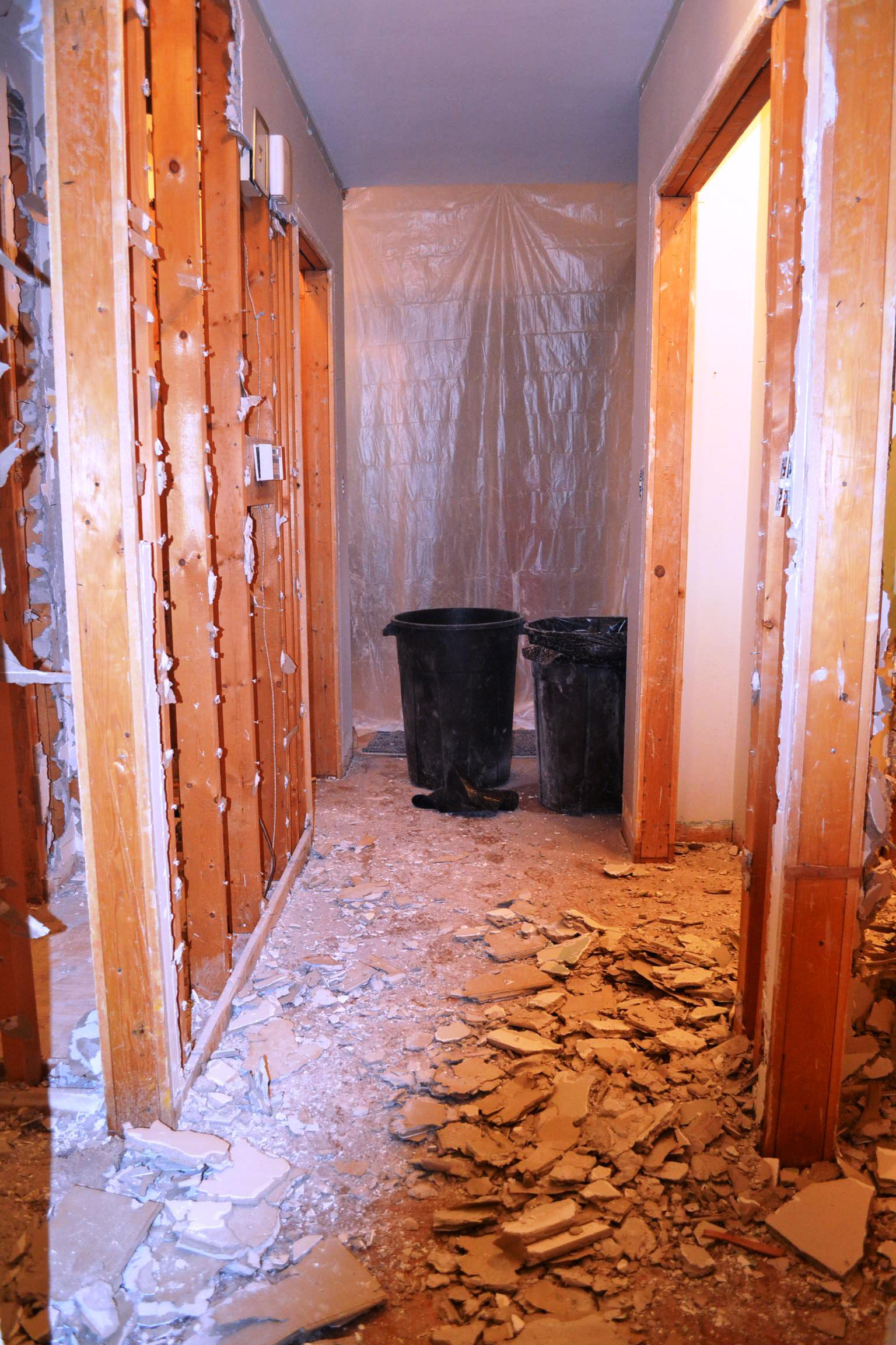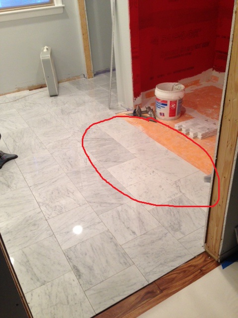 Ryan and Carpenter Al took hammers to those beautiful marble tiles. They did a smash and grab kind of job. The marble won’t pop out in whole pieces so crushing is the only option. In 20 minutes, all 7 were out and ready to be replaced. (For the record this was not at my request. This was all Ryan. He said something about me complaining five years down the road and to him this was the easier option… I have no idea what he is talking about). Luckily, we had plenty of leftover tiles so it didn’t really cost us extra. (notice how those 7 tiles are way darker from the rest of the floor? that’s the moisture I was referring to)