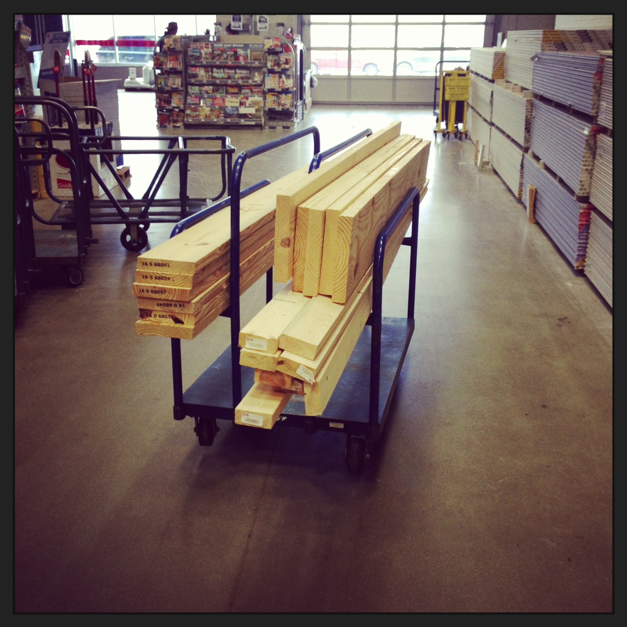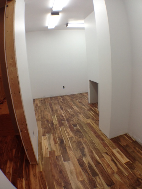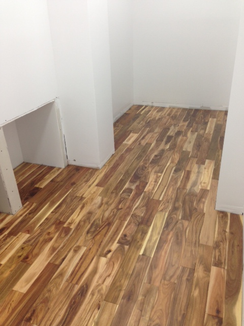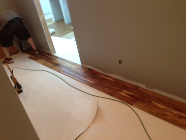 I’d like to think I am a very gracious winner. Since I won the battle-of-the-floors Ryan got to choose the hardwood. We headed to Lumber Liquidators just to “look” at their inventory, but of course made a purchase that same day. Ryan chose Acacia. And here’s the reason: It’s known for strikingly dynamic grain and knots (which he loved) and it’s one of the hardest woods in the world (which I loved), so it was good for dogs. Win-win situation. We loaded (and unloaded) 21, eighty six pound boxes of this stuff. Lift with your legs, not your back.