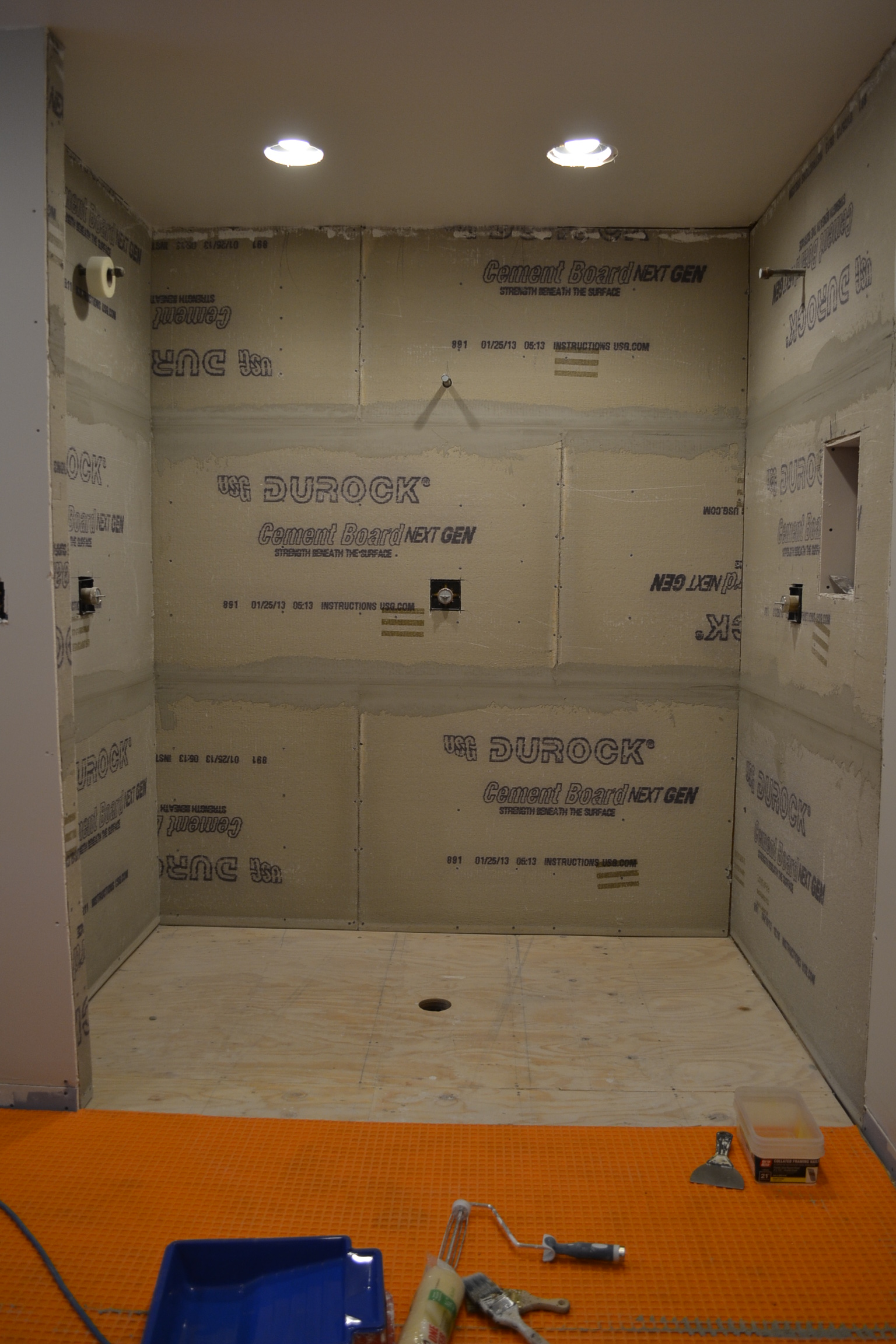 Now for waterproofing the shower, we were supposed to use Kerdi panels on the walls, also a part of the Schluter system. Of course the ceramic wall tile we bought was not recommended for use on Kerdi panels. So we went all old school in the shower and used good ole Durock cement board and mortar.