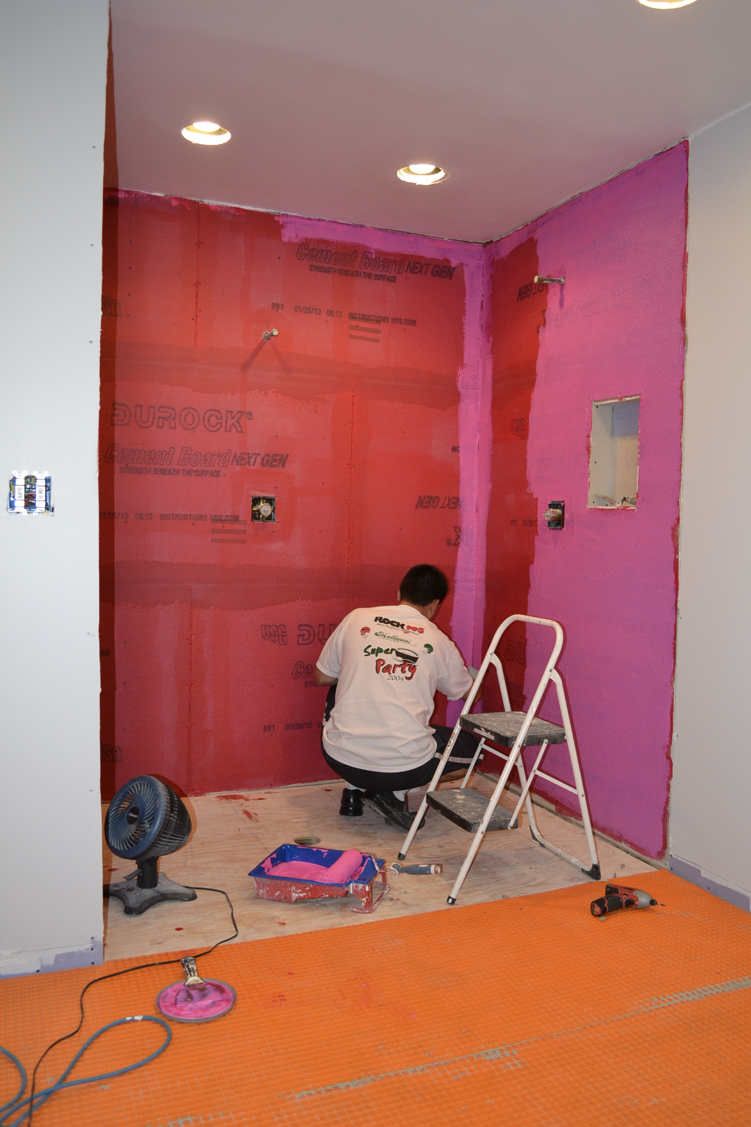 The trick to the RedGard is to make sure you are getting it on the wall thick enough. I can’t remember how thick it was supposed to be but it says on the bucket. It took about 3 gallons to waterproof our 5×8 shower. It says you can use this anywhere you want to keep water out…basement walls, etc…