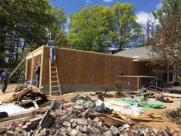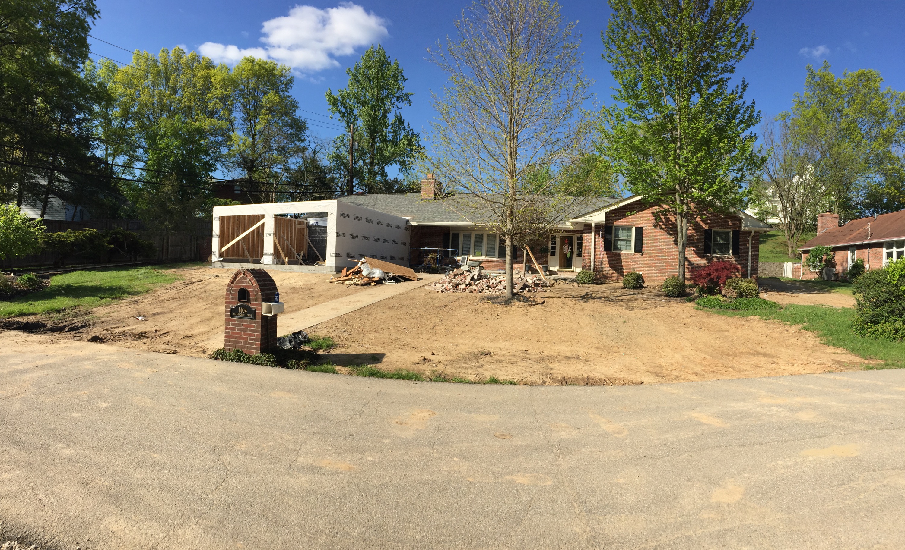 The garage doors will face the front of the house,creating a safer exit from our driveway. We pulled the trigger and our contractor broke ground last week. In under a week he got an excavator in, foundation footer poured, brick removed from the existing garage, and today the guys laid all the cinder block. By the end of the week we should be all framed up and hopefully under a roof!