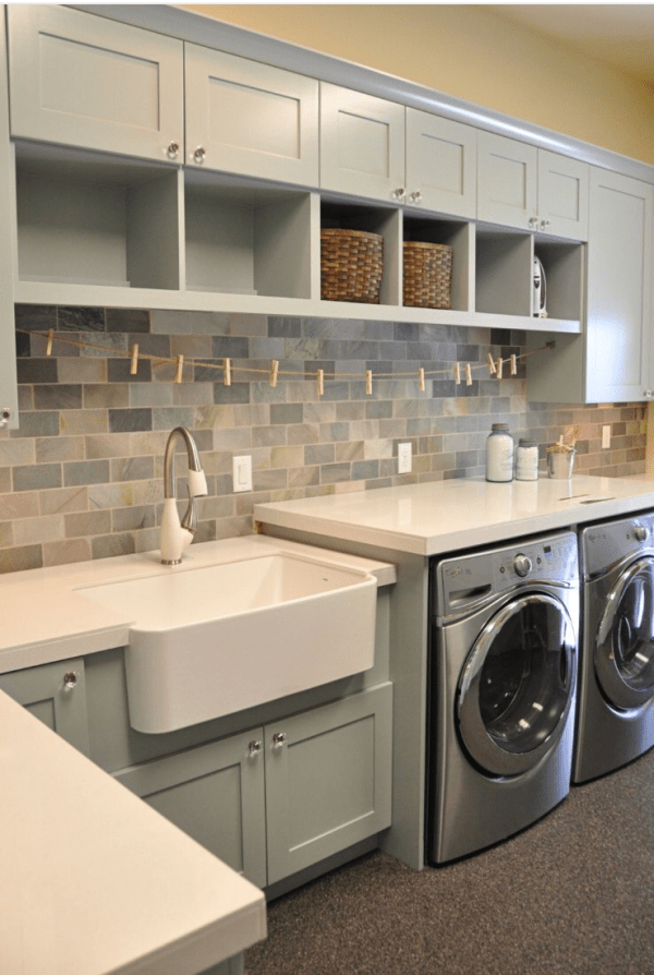 Now enters crazy idea #108. Should we try to add a laundry/mudroom to this space?? Currently our laundry room is in our finished basement. It’s small, but it’s a nice space. Nothing’s really wrong with it except it’s in the basement. I’m always thinking re-sale. And it would add a lot to this house if there was a main floor laundry room. When we designed our master bedroom we made sure to allow for 36” doorways to keep it handicap accessible and designed the shower without a curb for the same purpose. If we add a laundry room to the current garage it would essentially make our house almost 100% handicap accessible, therefore appealing to older home buyers or families with small children. When we met with our contractor, who is Roger Spaulding by the way (we keep getting asked that question), he let us know adding laundry facilities might be a bigger (which equals more expensive) project than we thought because of drainage. If we have to tap into the drain on the other side of the house it will be a forgotten project. In my head this laundry room will consist of white cabinetry to match the kitchen, marble countertops, a glass subway tile backsplash, a ridiculously large white apron sink to wash the dogs, a coat closet (which already exists in the space), and room for our extra fridge.