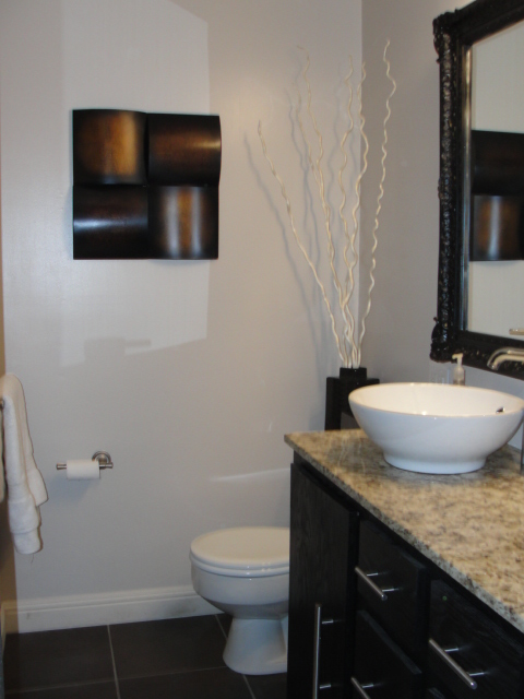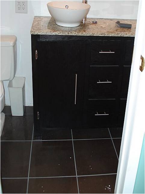 Lucky for us, Ryan’s dad has a woodworking hobby. He very graciously built this extra tall vanity that I designed. We stained it black and added some hardware and granite countertop. We love the design of the vessel sink (although not very kid friendly, if you have them) so after the vanity and tile were set I set out to research them online. I was able to find a good deal so I had the sink and faucet shipped.