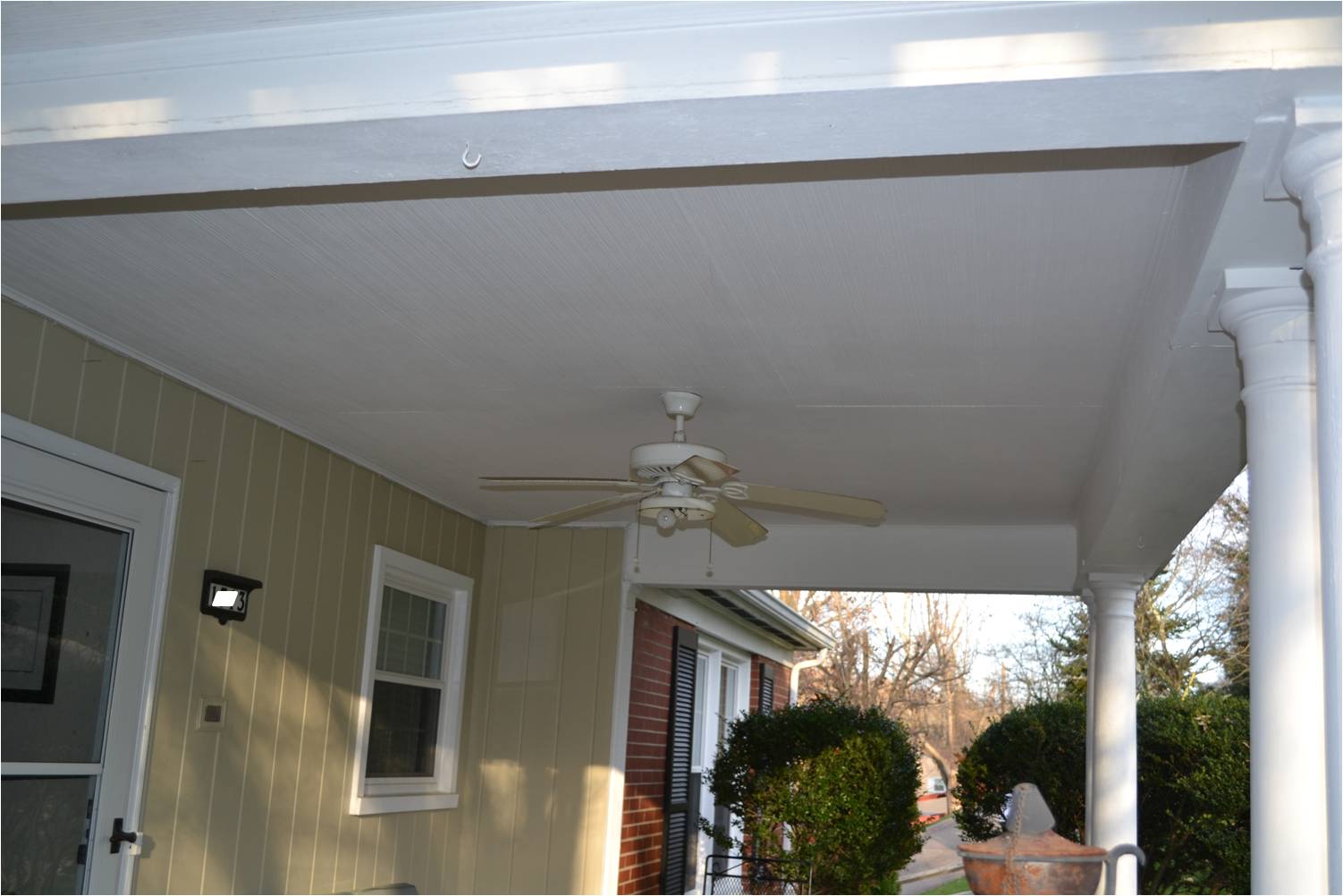 So once the pillar painting started, that led to the underside of the trim getting painted. Once the under part of the trim was painted, the inside trim needed to be painted. Once the inside trim was painted, the ceiling needed painted. It was a vicious cycle. So yes, I ended up painting the ceiling of the front porch. I had been meaning to do that for the past few years. This obviously was the time to do it. It took a painstaking 4 hours, but well worth it in the end. I can’t help but to keep dancing looking up at the ceiling!