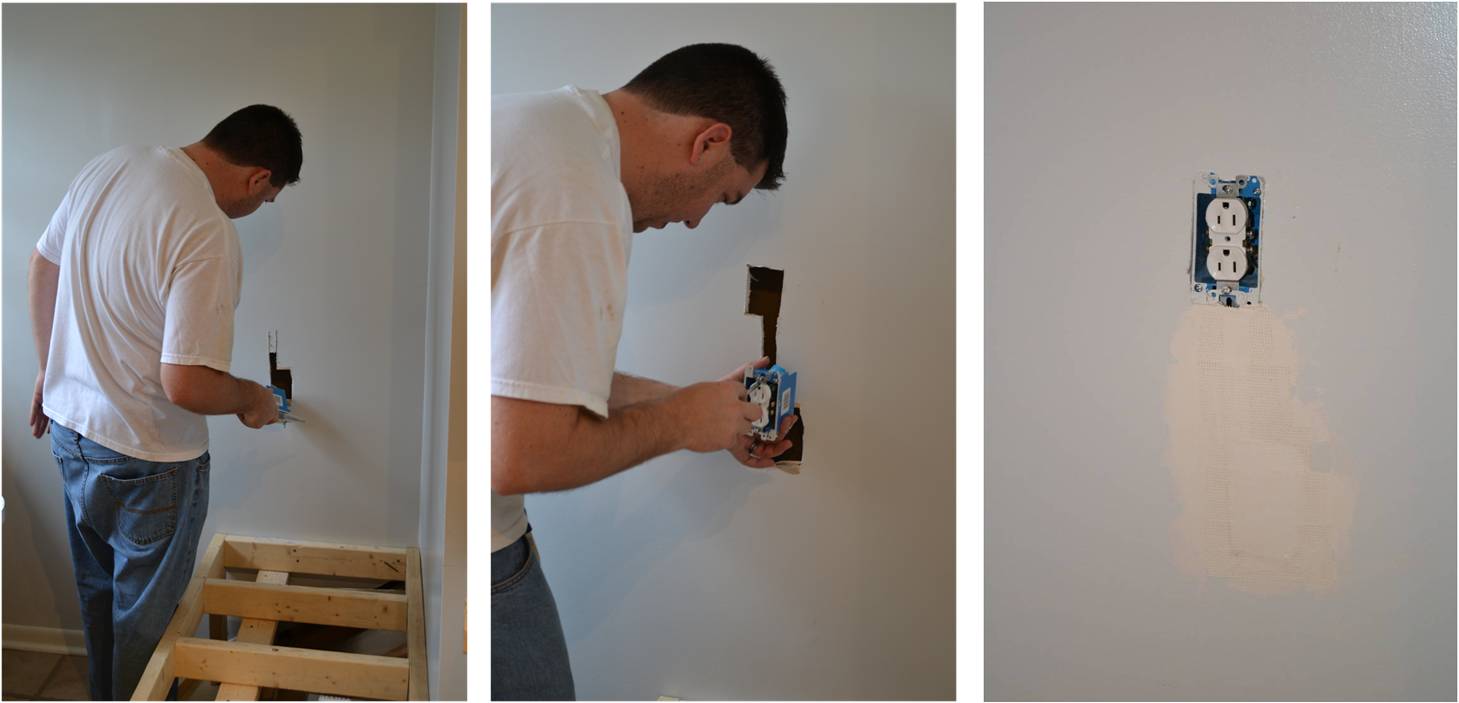 Last time I posted about the kitchen project (here) we were in the process of moving an electrical outlet. Because our kitchen counter top will sit 34″ the existing wall outlet needed to be moved on up. Ryan did so by cutting through the drywall to move the wires and box. In the past few days I have been mudding and sanding the wall.