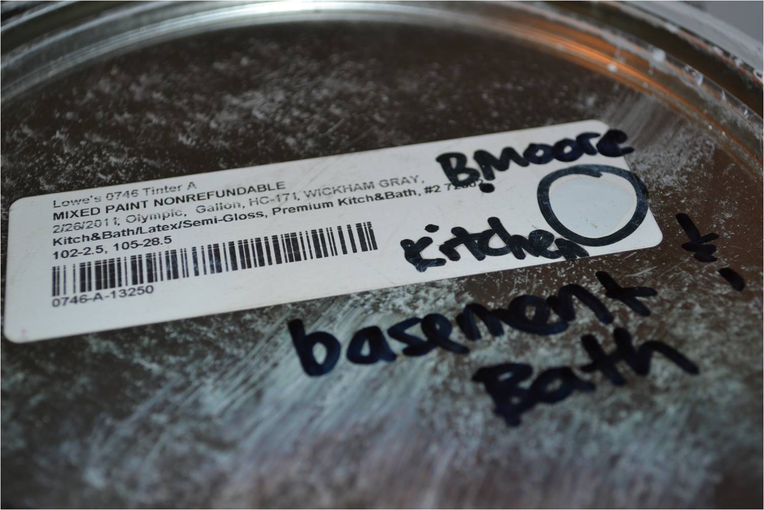 As I mentioned earlier, the paint color is Wickham Grey. I mark all my cans of paint with the color brand (“BMoore” stands for Benjamin Moore) and where I painted the color. If you like color like we do, and you paint often, this is a very useful tool for when you need to touch-up. As you can see from this can, I also painted Wickham Grey in the basement bath.