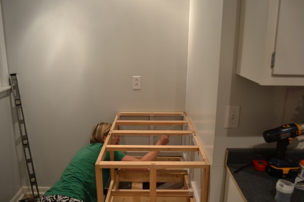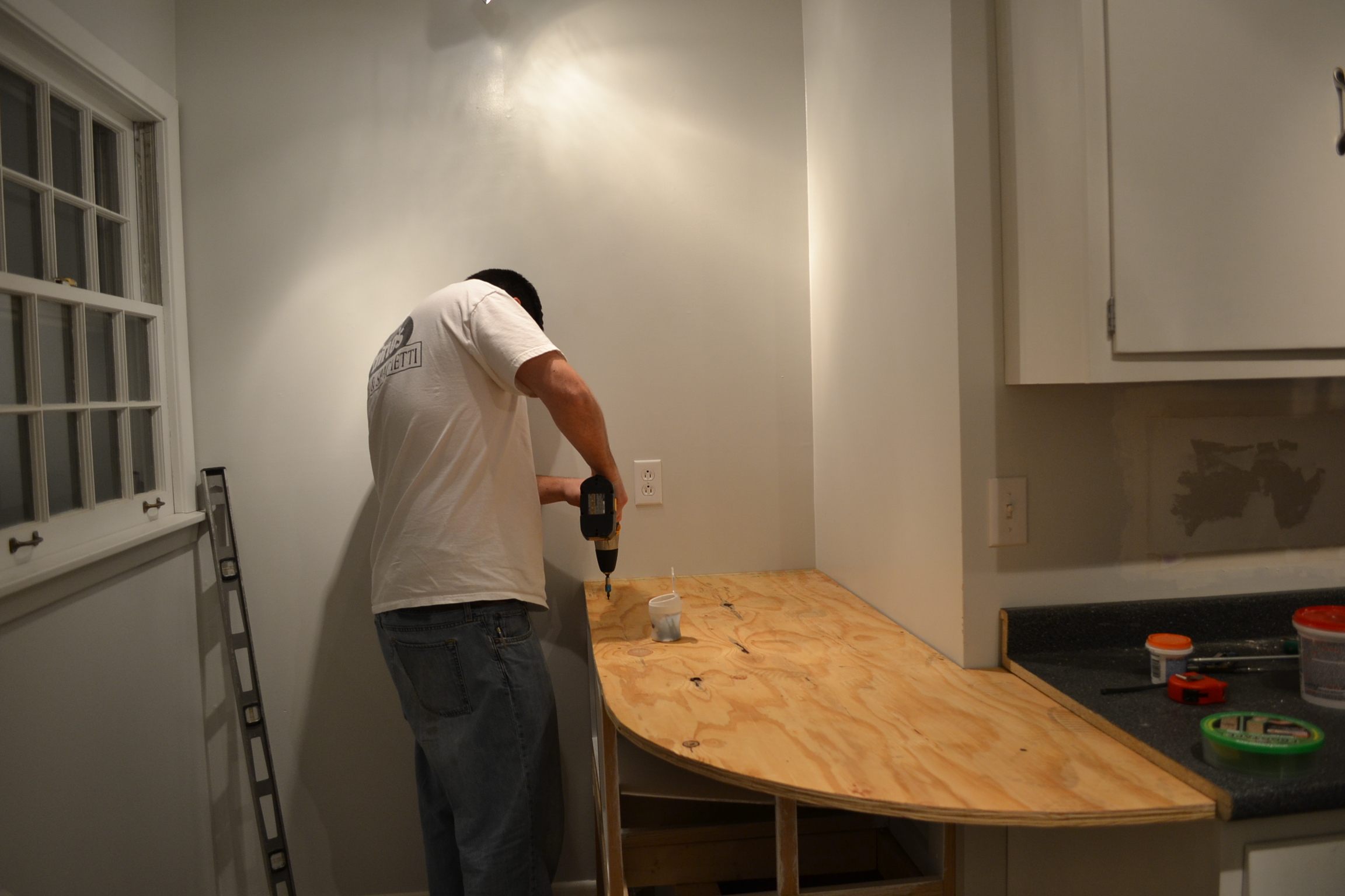 When we left off with the kitchen project we were “Making Sawdust” (more posts on the kitchen found here, here, here, here and here). Now that the dust has officially settled (for now) it’s time to get some things secure from the inside. Ryan put a few screws in the frame and wall of the custom base cabinet, so she isn’t going anywhere!