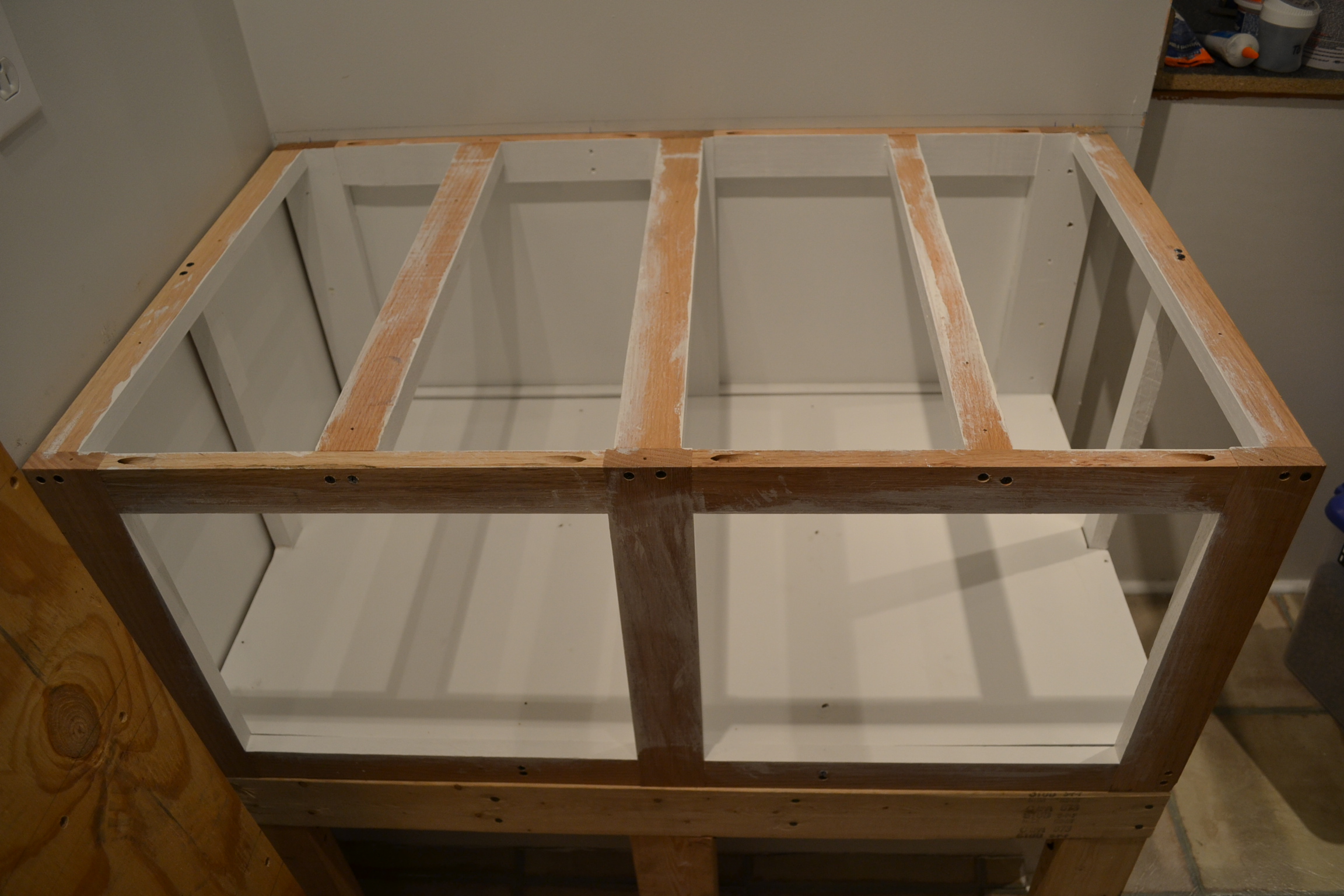 Now that all the interior painting of that cabinet is finished Ryan was finally able to screw in his counter top base. He drilled a bunch of pilot holes before drilling in the screws, but I neglected to snap photos of that…sorry! So now we are officially with an extra (sort-of) counter space. It’s already being used for tools, dog food, etc…can’t wait to get counter tops on that thing!