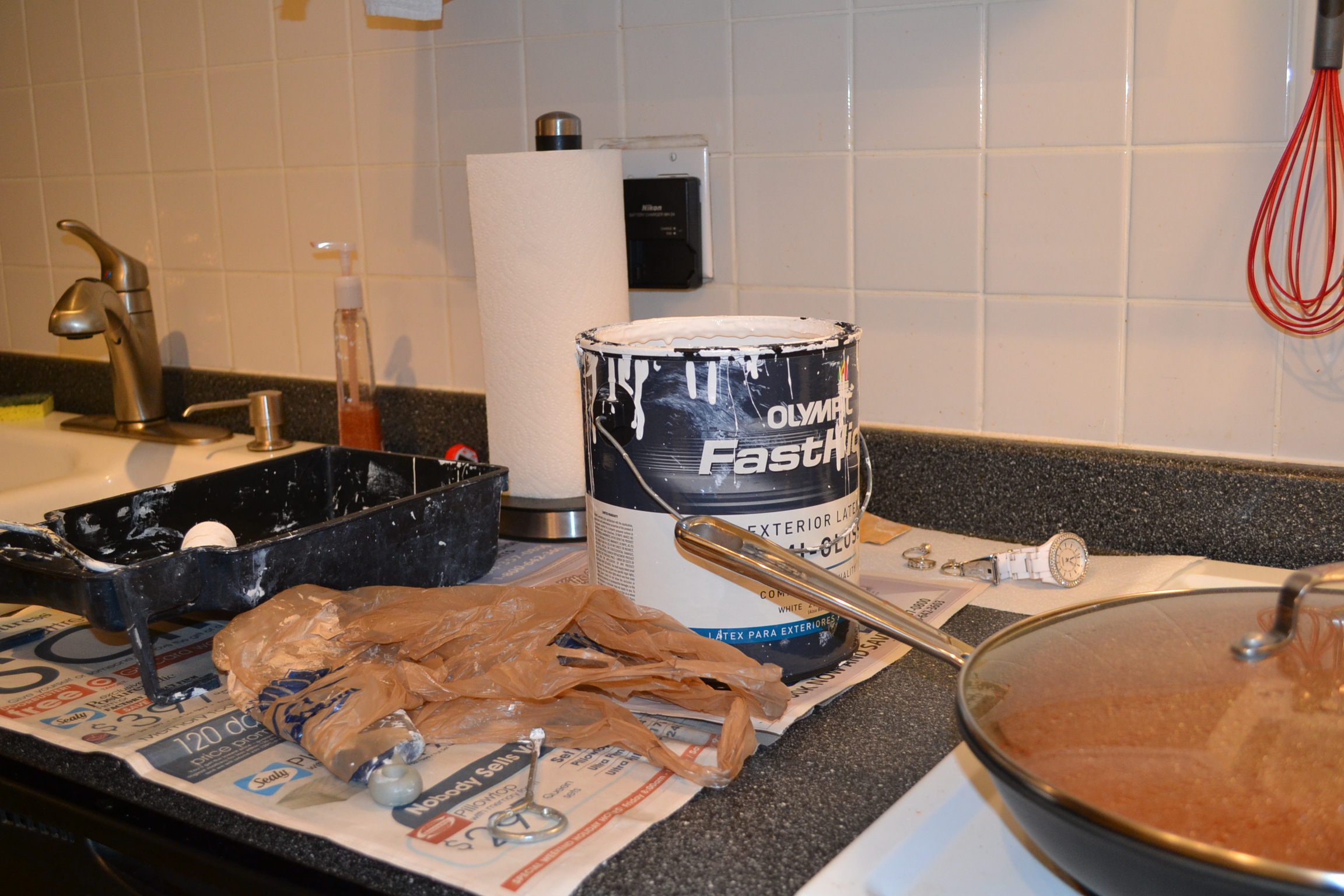 And again….break out the paint to make some touch-ups on that bottom shelf. Yes, that is dinner cooking next to my paint below…we are multi-taskers after all! Also, in case you didn’t know (my mother taught me this) you can keeping paint brushes and rollers tightly wrapped in a bag in the fridge. This is very helpful when you have paint/touch-up on going…It’s such a pain to wash those things out! Just don’t forget you have then in the fridge, they don’t last forever, you know!