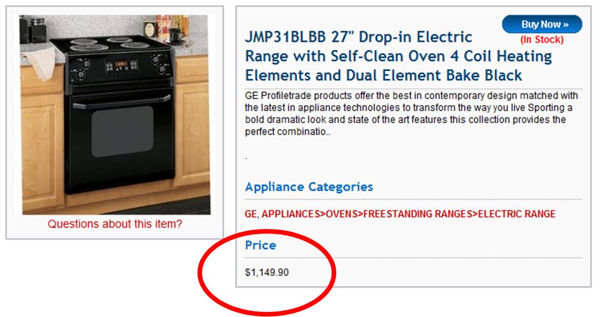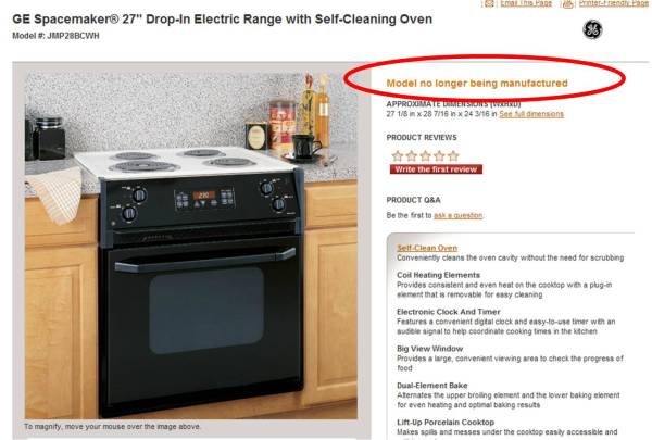 Our goal was to find a matching unit (for a good deal) at our local Scratch and Dent appliance store. This is the same place we bought our refrigerator about 5 years ago, which ironically, has no visible scratches or dents. When I took the measurements of our current GE (27″ wide and 24″ deep), I noticed that it didn’t touch the floor. Hummmm….we have lived in the house almost 6 years and never realized our oven was a drop in unit. Okay, whatever. Off to Scratch and Dent we go. It turns out our unit is (like us) completely abnormal. The sales associate informed us this is a custom/special order unit. Boooooohissssssss. Apparently, having never shopped for an oven before, the standard size is 30″ wide. Because we can’t afford to lose the four drawers to the right of the oven, it is not an option to take them out and put in a standard, free-standing unit. No problem, we’ll replace it with a stainless 27″ drop-in, right? Not that easy. It turns out GE is the ONLY company that makes a 27″ drop-in. Here is our current unit from the GE website: