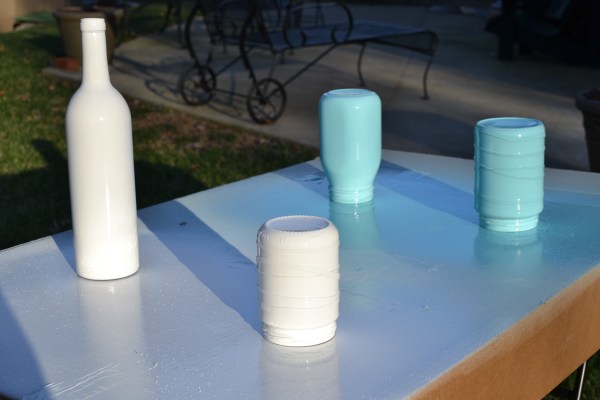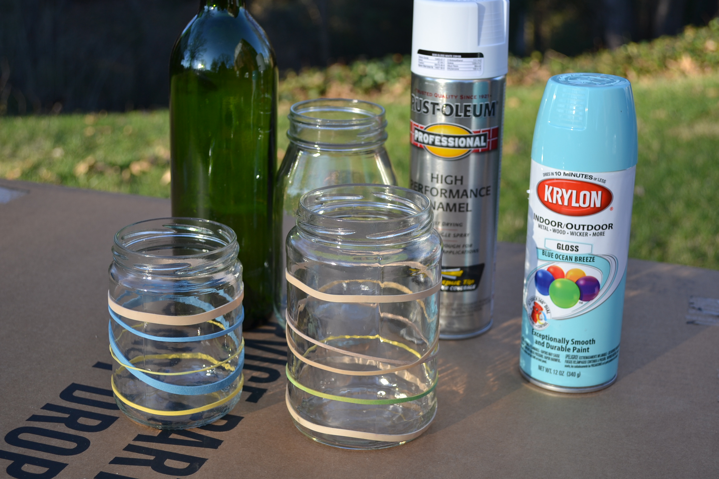 I decided on the lower right pin, covering vases/jars with rubber bands and spray painting them. This past weekend I gathered some of the jars and set up shop outside.