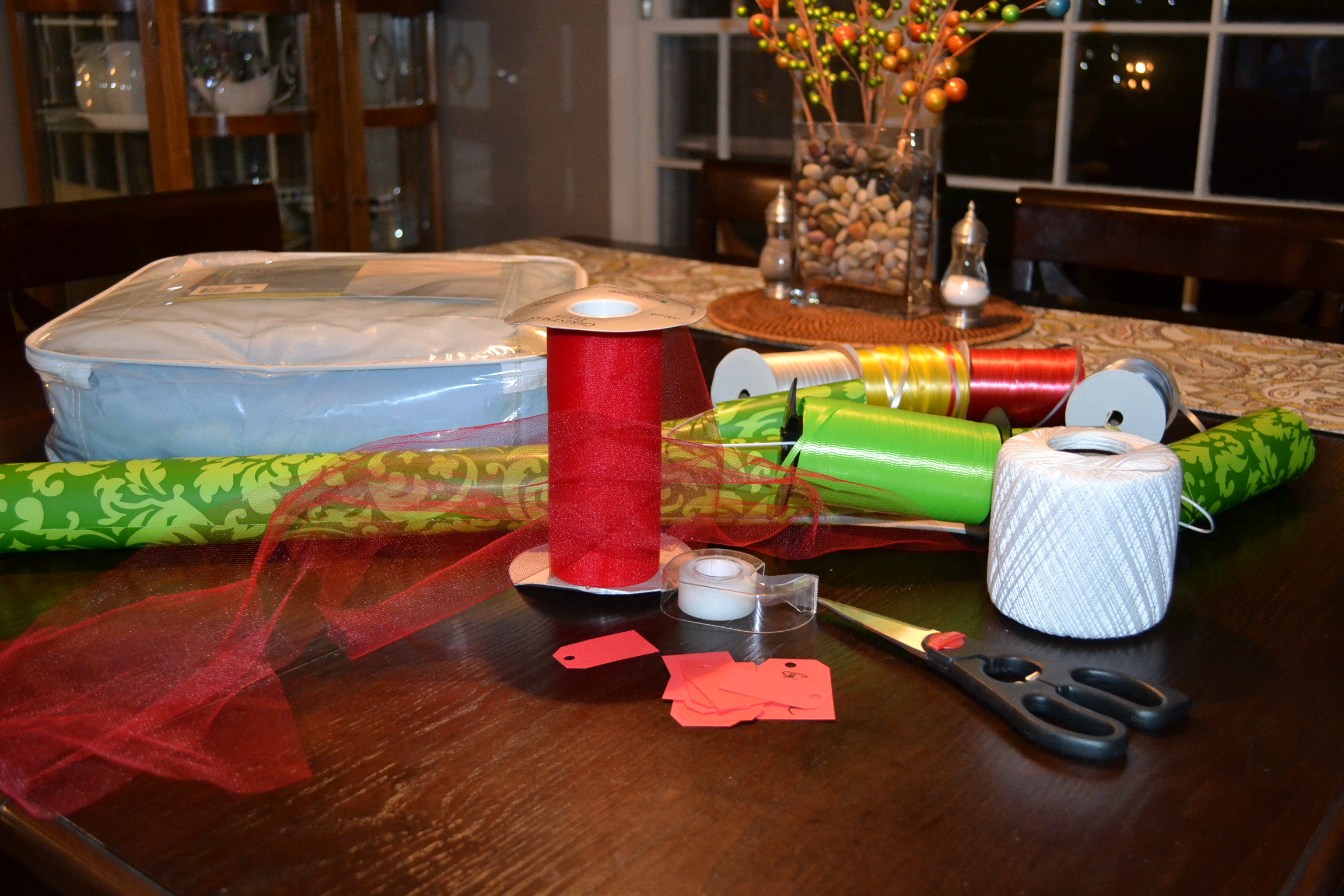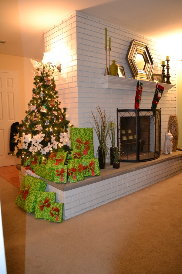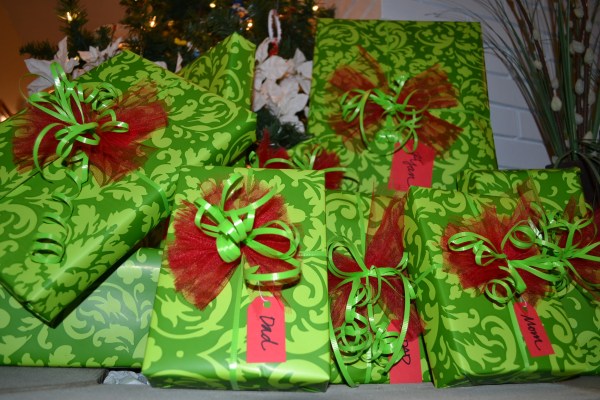 I won’t lie, it me a few hours to wrap thirty plus gifts. Good thing there is a plethora of syndicated episodes of The Big Bang Theory on the boob tube ! I took this ‘after’ photo late at night, so excuse the awful lighting.