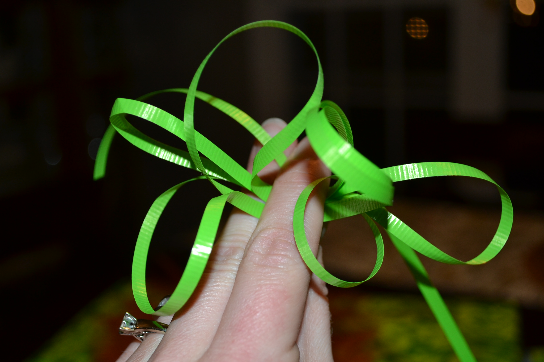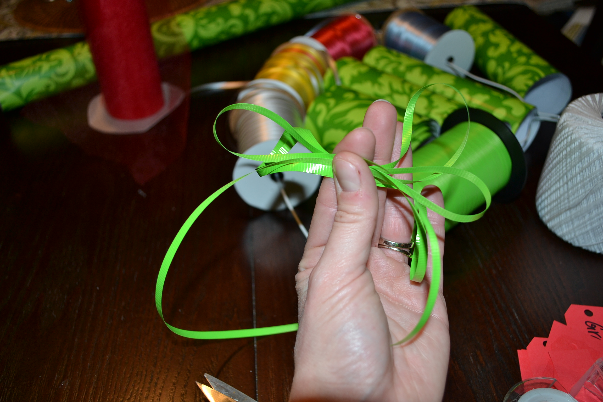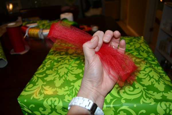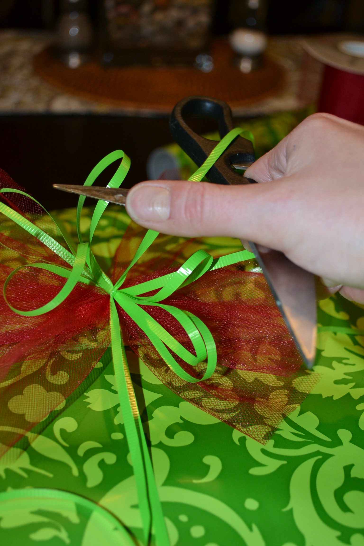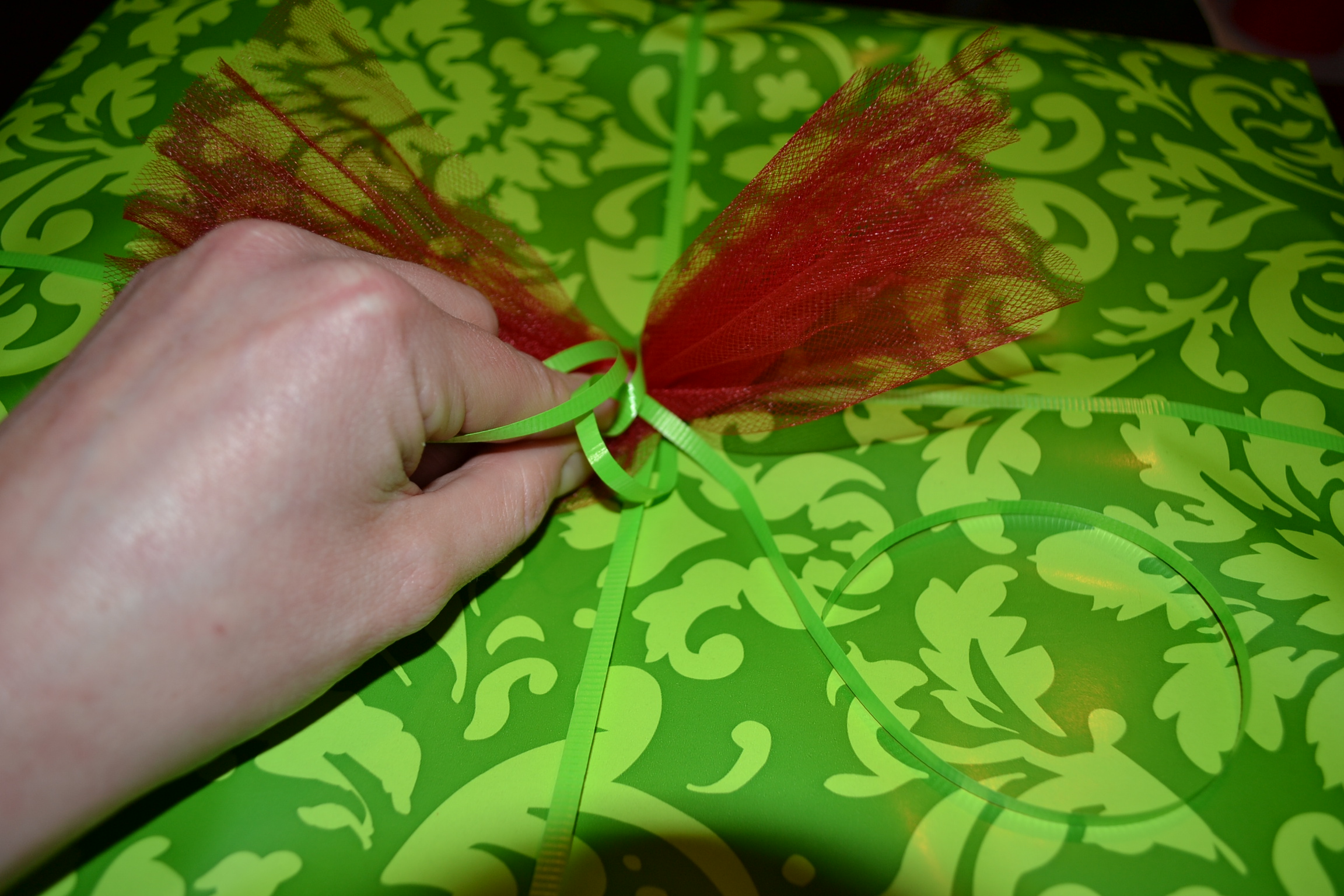 I then secured the curling ribbon bow in the same fashion I secured the tulle, with the ribbon around the package and knotted it.