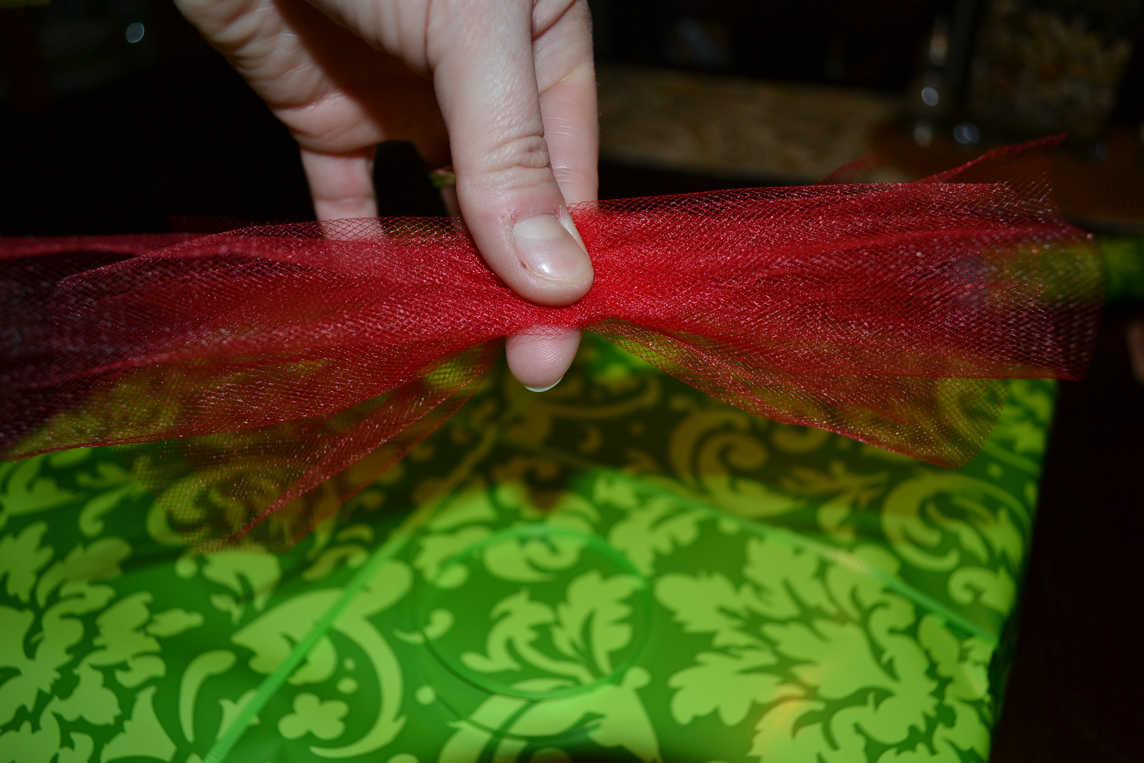 Holding the cut tulle really tight, I secured it withcurling ribbon that was wrapped around each box. Make sure to knot the curling ribbon tightly so the tulle stays in place.