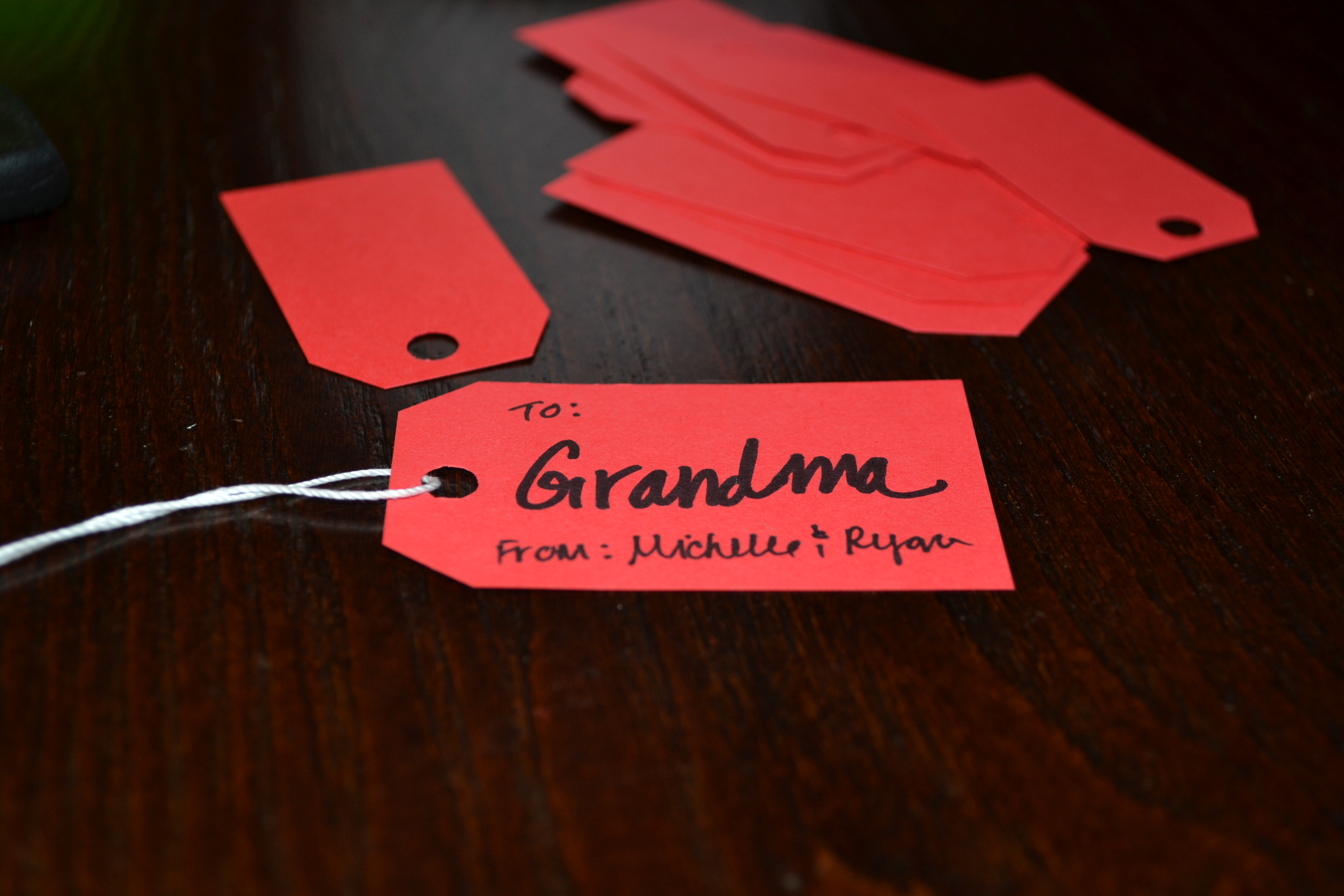 Over the weekend I was on the hunt for some cute name tags to go on the gifts, but there was nothing out there to match my wrapping paper. Although, I did come across super-cute red and white swirl tags at K-Mart. They were two bucks for a pack at four. With over 30 gifts to wrap, that was going to cost the Yarbauer’s a pretty penny. Instead, I went online and found a template that I could print out on red card stock and cut out, found here.