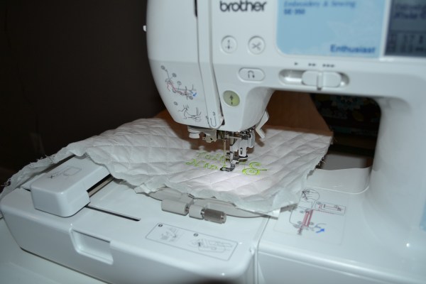 After looking at it for a bit, I decided to search for some left over white fabric in my scrap bin. I could use my sewing/embroidery machine (mentioned here) to monogram and (hopefully) piece together a matching stocking for our pups!