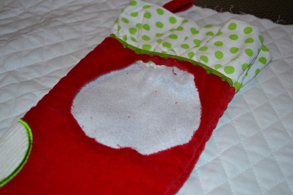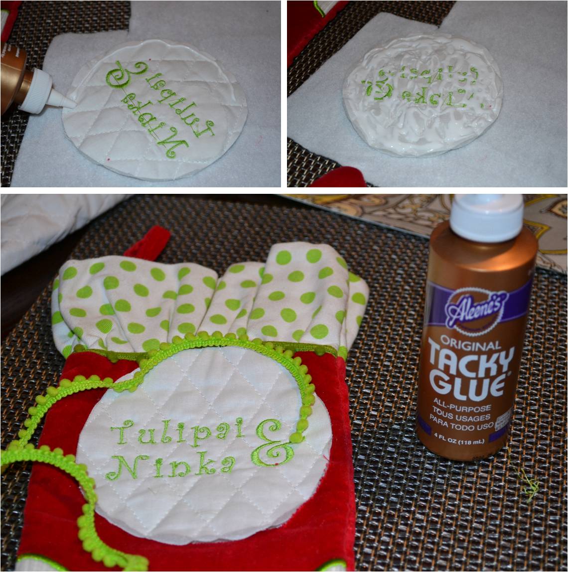 I had some craft glue on hand, so I generously applied it to the back of my custom made patch and pressed it into place in the hole on cut up stocking.