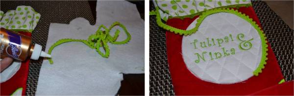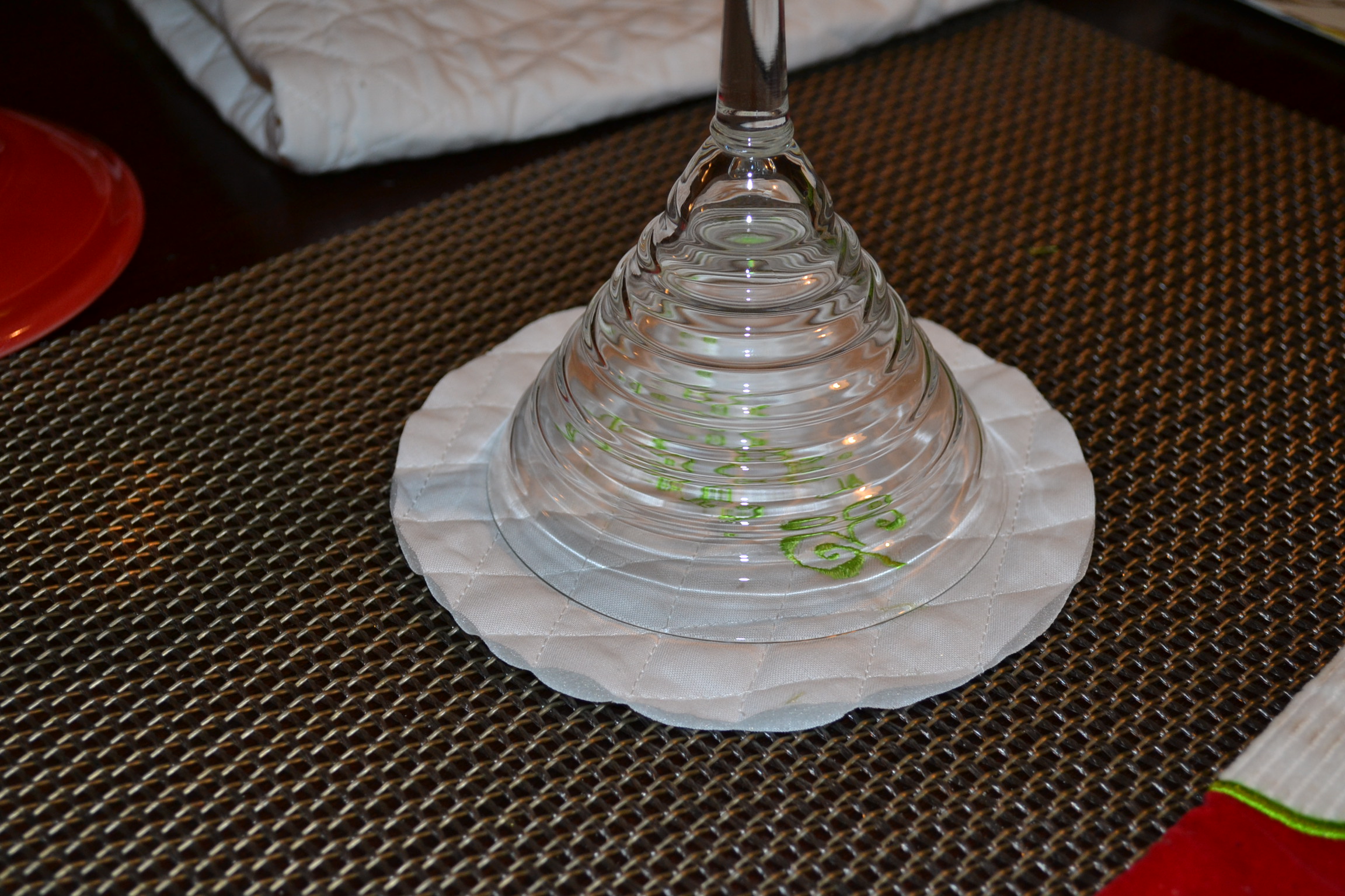 I luckily have the “twisty curls” font for my sewing machine, so the lettering matched perfectly. To get the circle cut out to the right size I used a martini glass and traced around it.