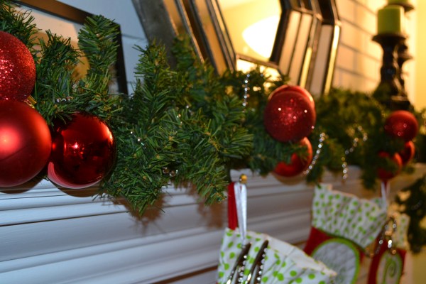 Not too shabby for a cut up stocking most people would have thrown away! Having all three (much desired) matching Mud Pie elf stockings, I decided to finally decorate our fireplace mantle for the Holidays. To be honest, I probably wouldn’t have taken the time to do so, since Christmas is only five days away, but these little beauties deserve a little bling! I stopped at Rite Aid on my way home from work, and with God on my side, they had one box of matching bright red ornaments! They also had some silver pearl beading which I decided to throw in the cart as well. Not too shabby for some last minute drug store finds!