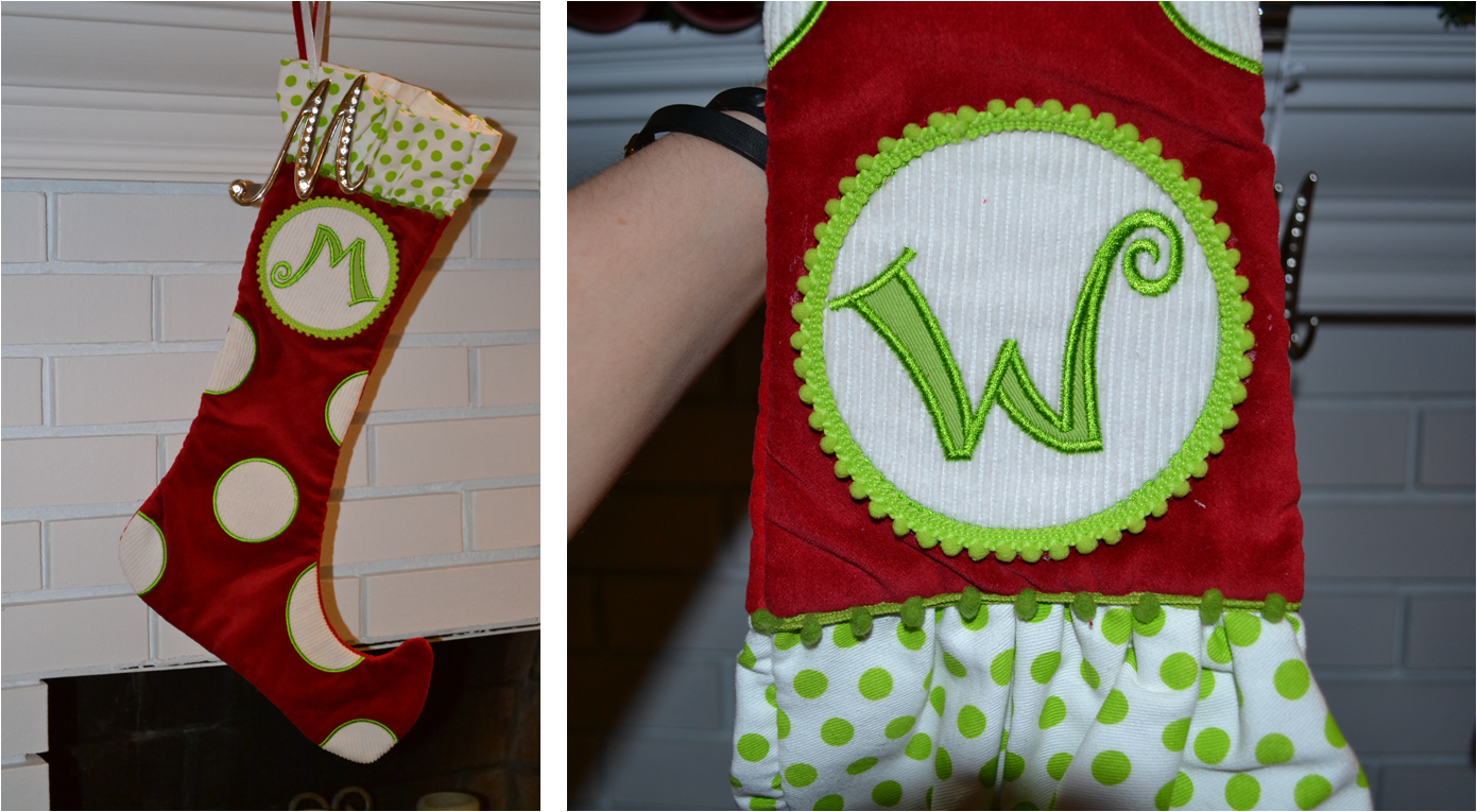 Of course the only initial they had was ‘R’ and I wanted a second matching ‘M’. I ended up not buying it since I was only able to find one to my set. My mother (unknown to me) went back to that store and purchased the ‘R’ stocking. She held on to it in for a year in hopes she could find me that darn ‘M’. Well, she didn’t. While shopping in Lexington over this past Thanksgiving, she randomly ran into these stockings again. But there was no ‘M’. My aunt noticed a ‘W’ and that a ‘W’ upsidedown could be a ‘M’! So mom bought 2 ‘W’ stockings and decided that she could sew something together by cutting out one ‘W’, turning it around and sew it back on the second stocking. (Yes, this is where I have learned all things sewing and craft-related!). That newly designed elf stocking, along with the original ‘R’ showed up in the mail on Monday.