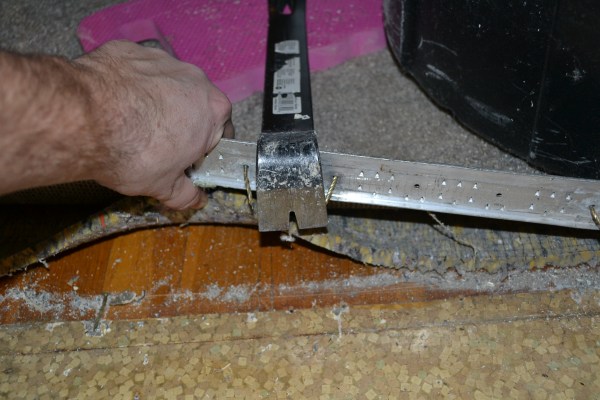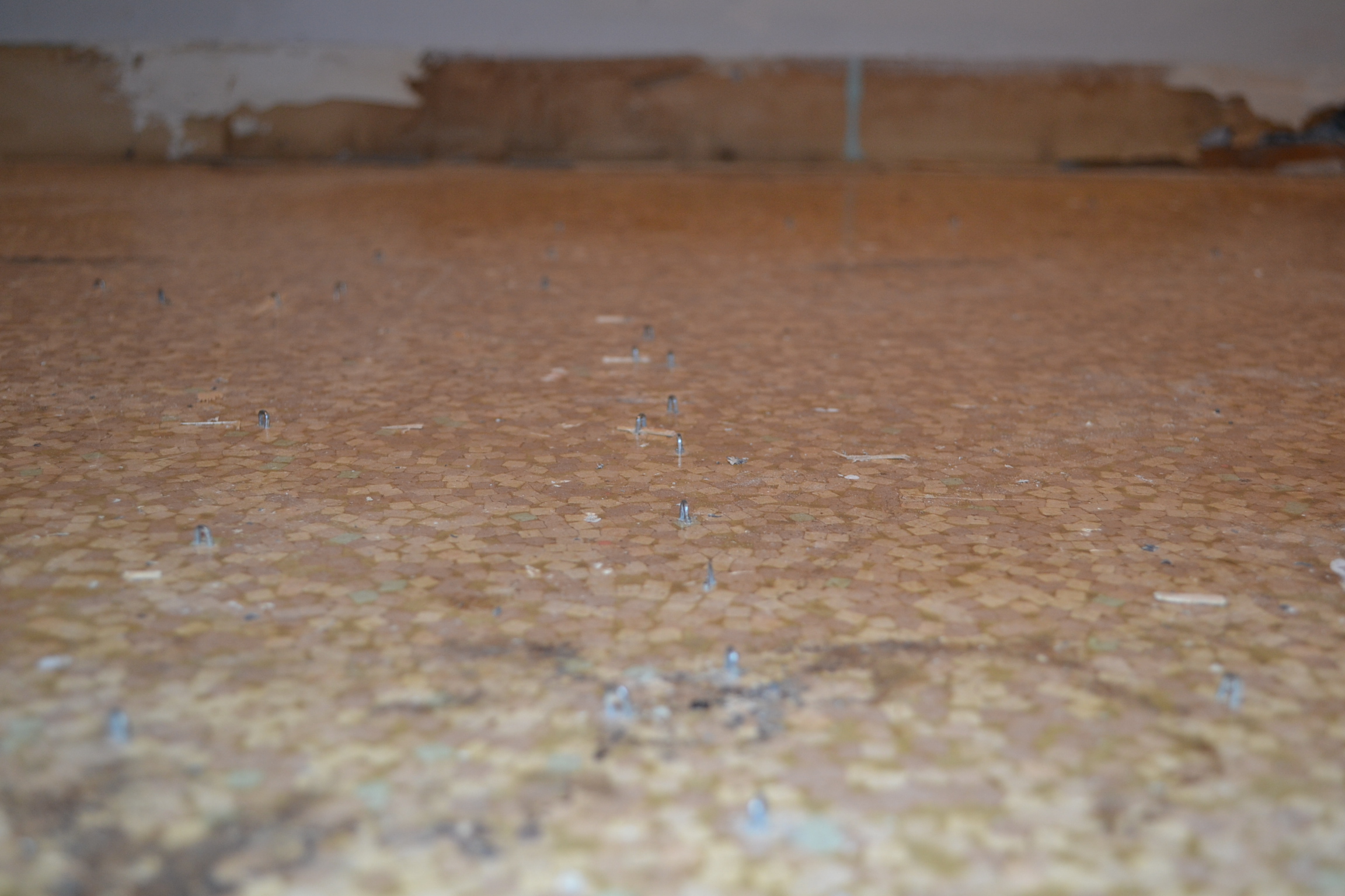 The 2nd layer of sub-floor was nailed in with brad nails. Many of them pulled up with the boards as Ryan pried them off, but a bunch still stayed nailed in the floor, making it slightly dangerous for our little pups. Can you see all those silver, potentially paw cutting nails protruding from the floor?