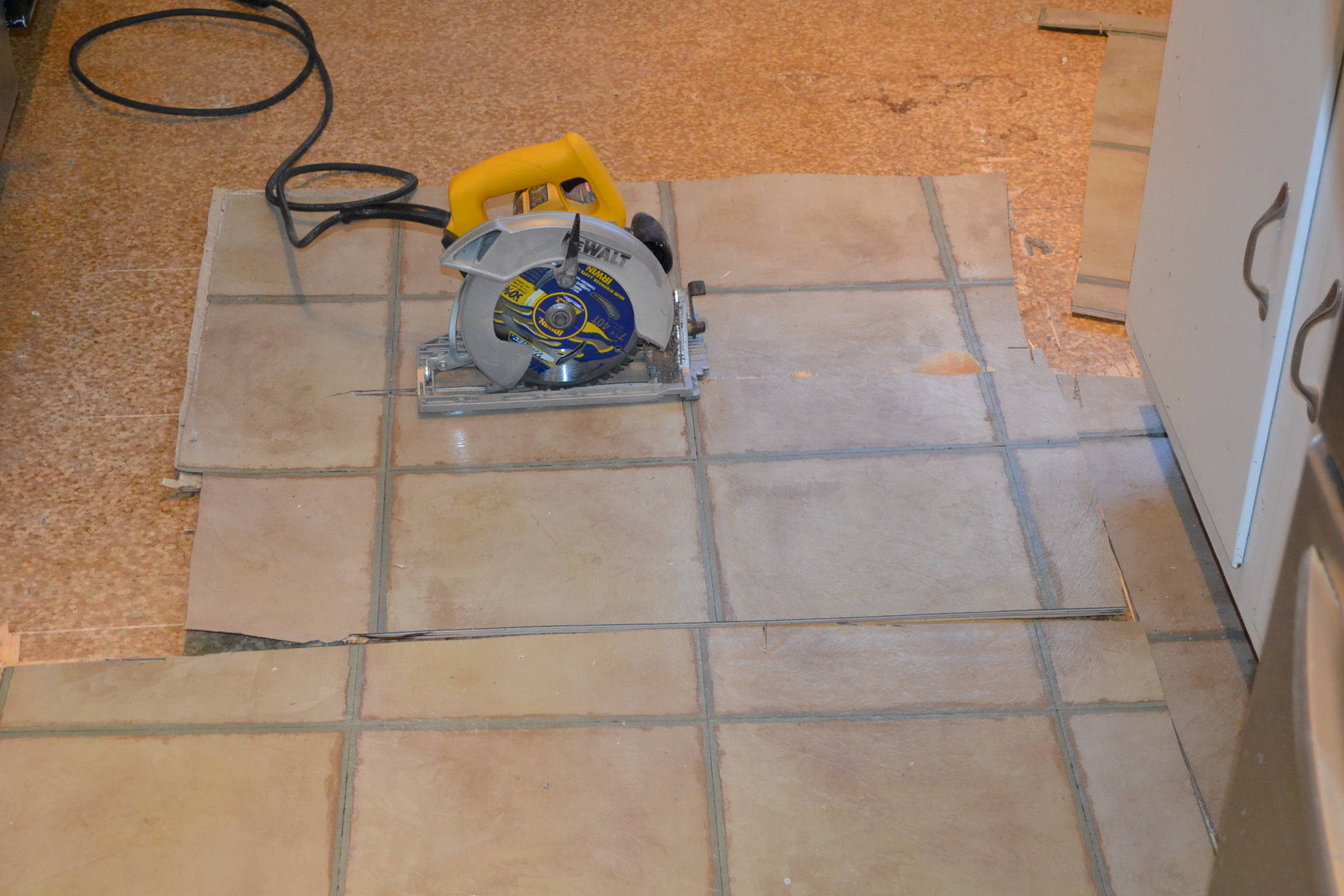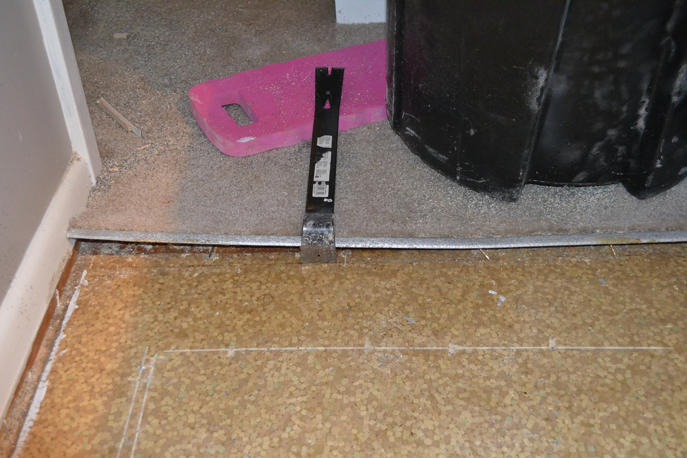 The original (circa 1960) laminate was covered by previous owners with a new sub-floor (only god knows when) and 2 more layers of flooring were installed on top over the years. Ryan got out the skill saw and carefully remove the old flooring by cutting it in pieces and prying it off.