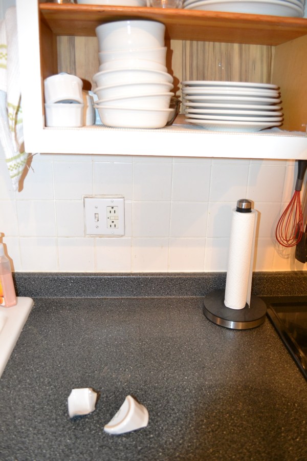 All that pounding must have moved the dishes out of whack. When I opened up the cabinet this little white ramekin fell right out onto the kitchen counter and broke…boo.