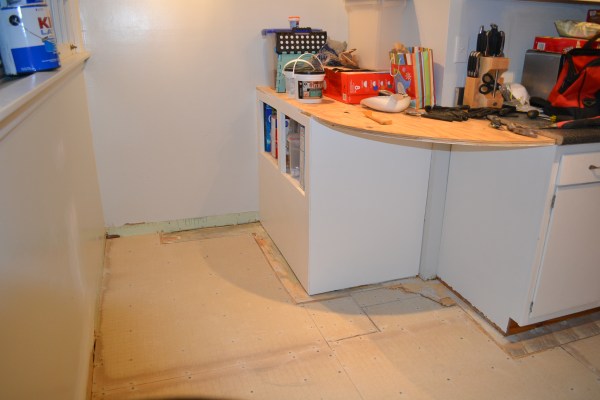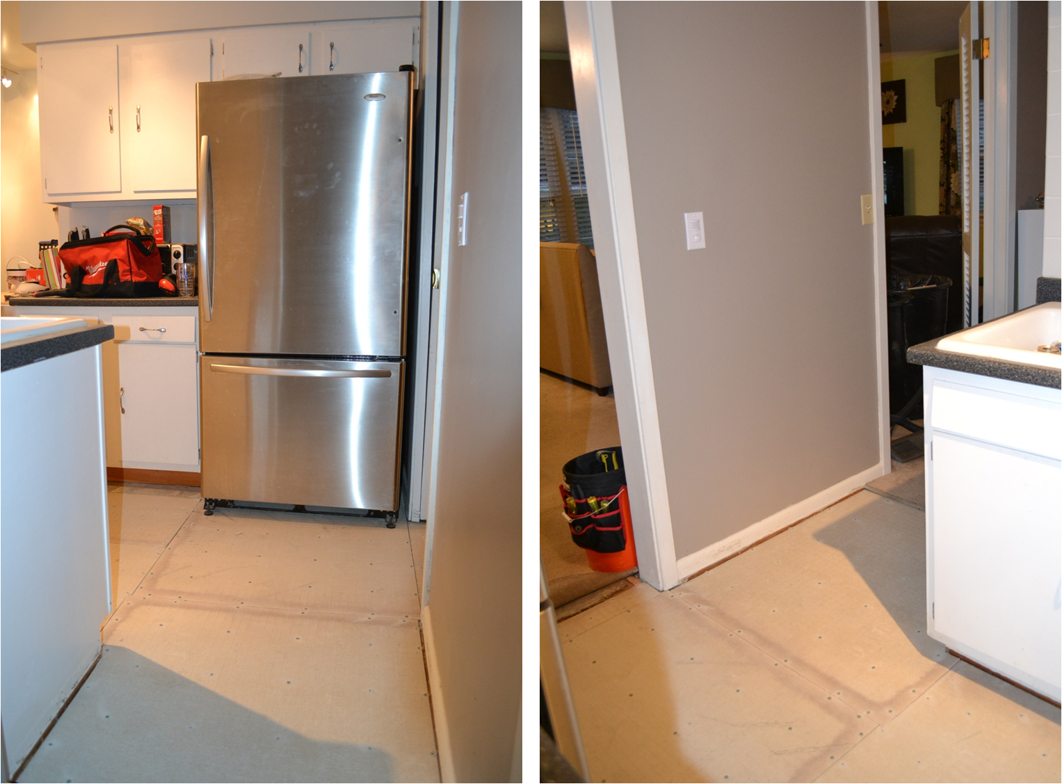 Yep, our circa 1960 laminate floor which magically disappeared (mentioned here) is officially covered with Hardie-Backerboard (more on that here)! We pulled out the fridge on Friday and pried up the last of the old laminate.