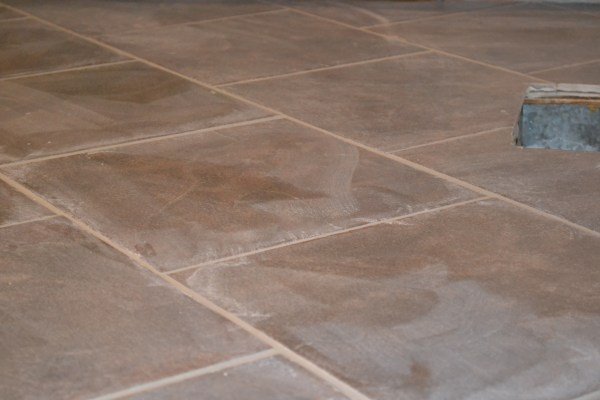 After covering10 square feet of tile I went back with a clean damp tile sponge to remove excess grout, making sure to fully wring out extra the water. I wiped in a circular motion, as recommended by the manufacturer. It was necessary to repeat the sponging step several times to remove the haze. Every 10 feet Ryan emptied and refilled my clean water buckets and I continued this process across the entire kitchen floor over a span of two hours.