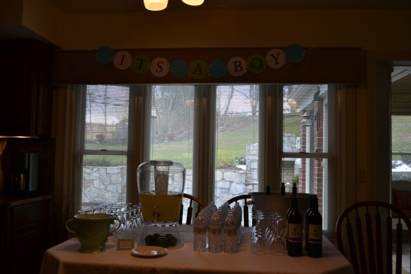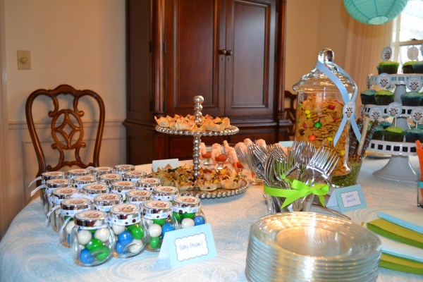 Instead of a guestbook, I opted for a ‘wish jar’. This was a place (at the front door) for all of the guests to write wishes and/or advice for the mommy-to-be. After they wrote their message it was placed into an apocrathy jar. The table was also graced with a balloon display and fresh vase of daisies.