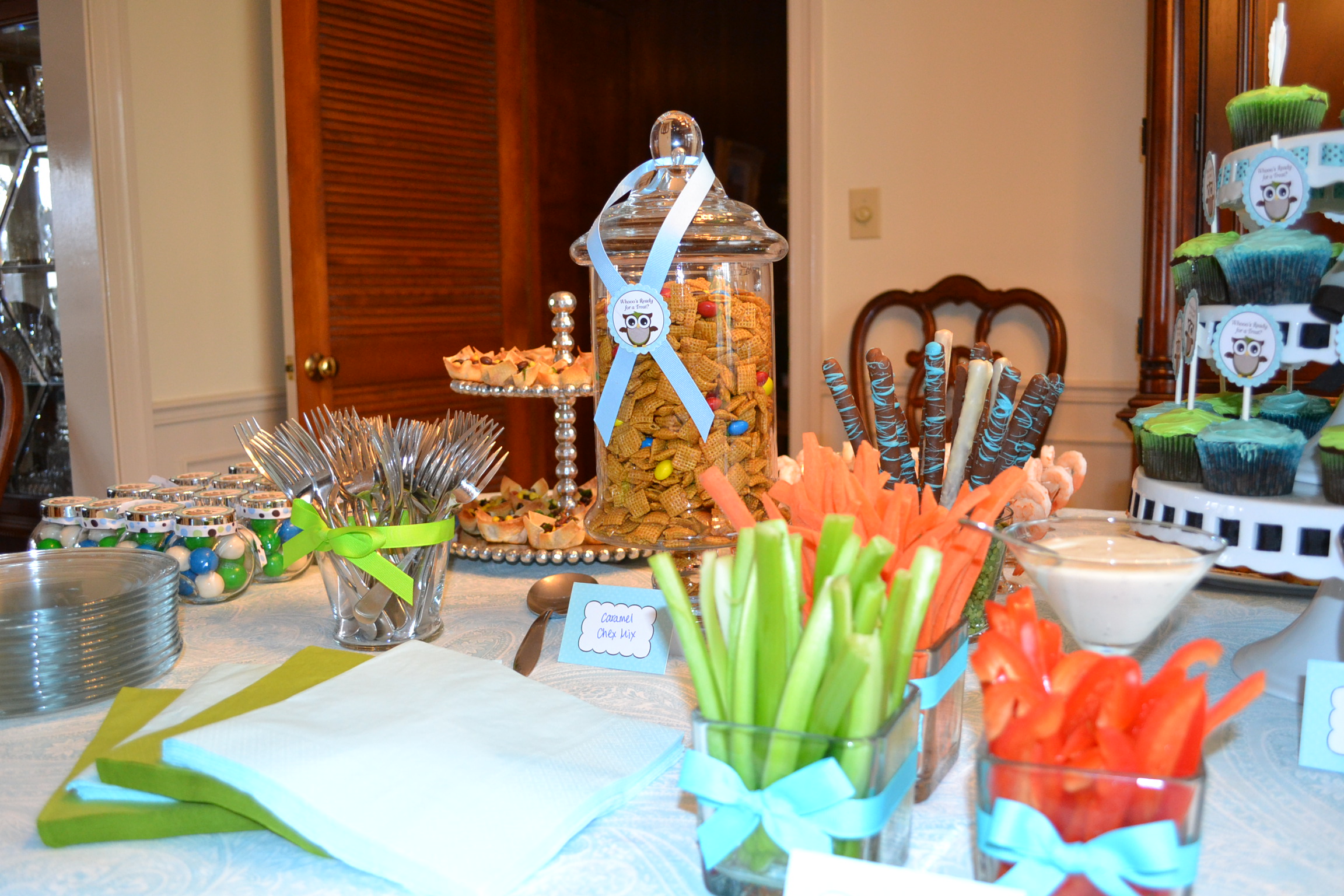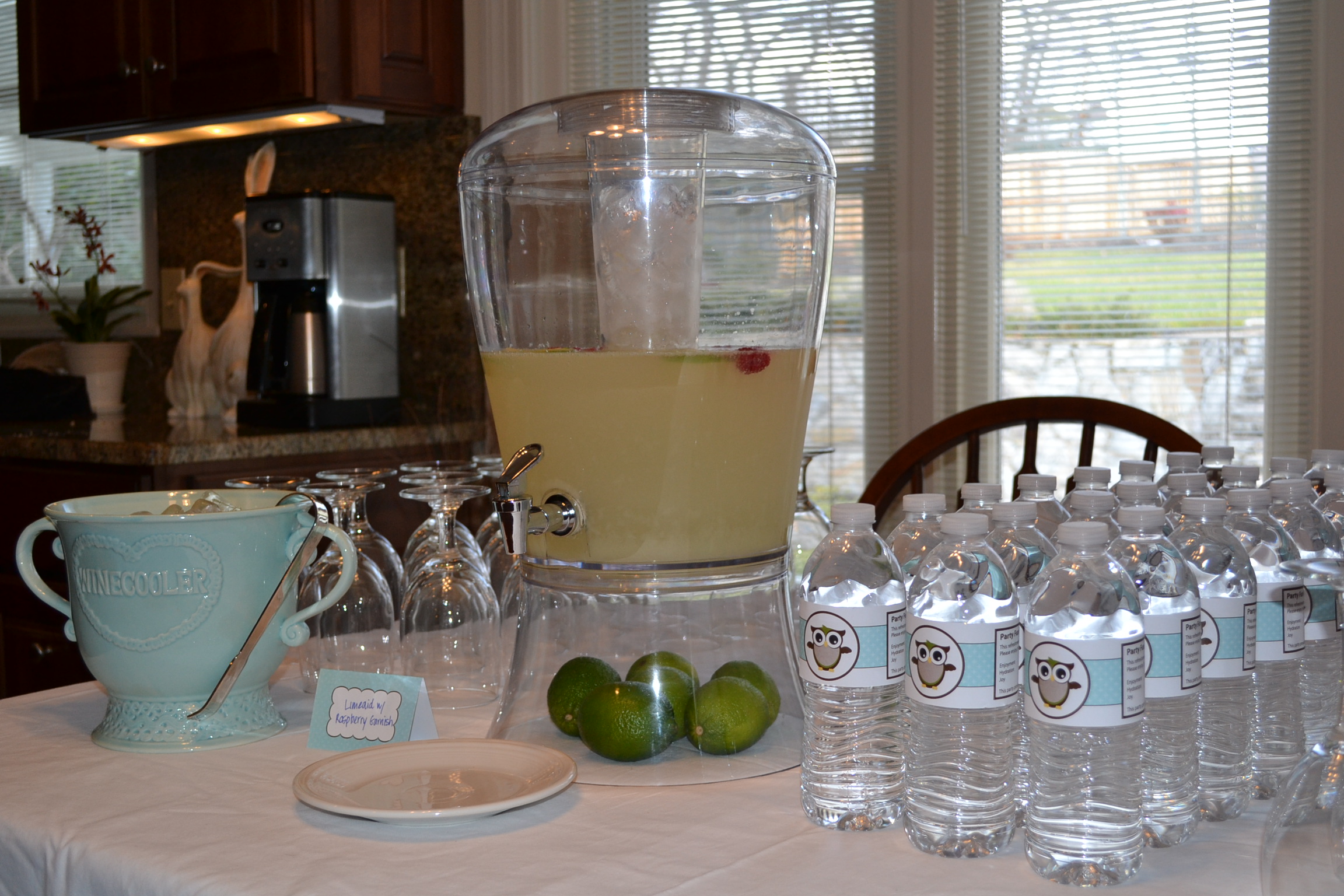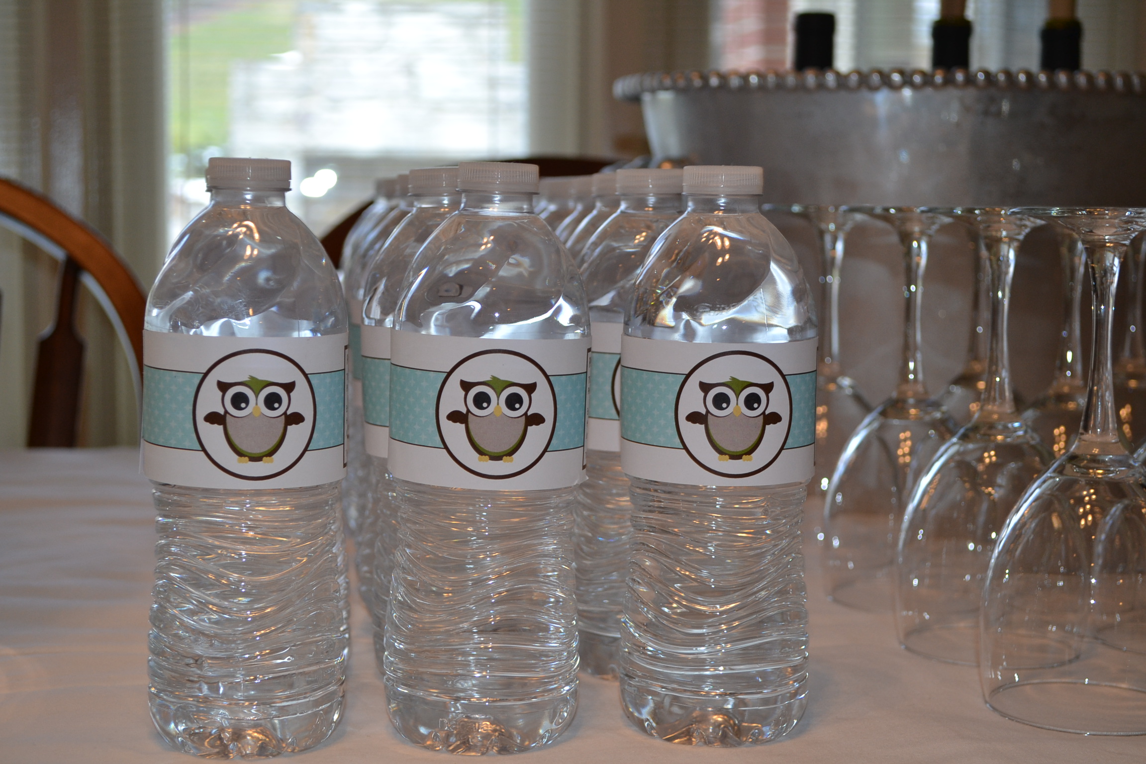 No, I’m not pregnant, but my good friend Amy is! This past weekend I hosted a baby shower for the mommy to be. Amy is about 4 weeks away from having a little boy, so I put together the most elegant baby shower I could. While perusing the internet, I found some really cute blue and green owl themed party printables on Etsy. Printables are a really cool way to add personalization to any party. You buy the design from a graphic artist and cut the labels, creating a DIY a themed party! I purchased some 2″ favor tags, water bottle labels, and tented table cards.