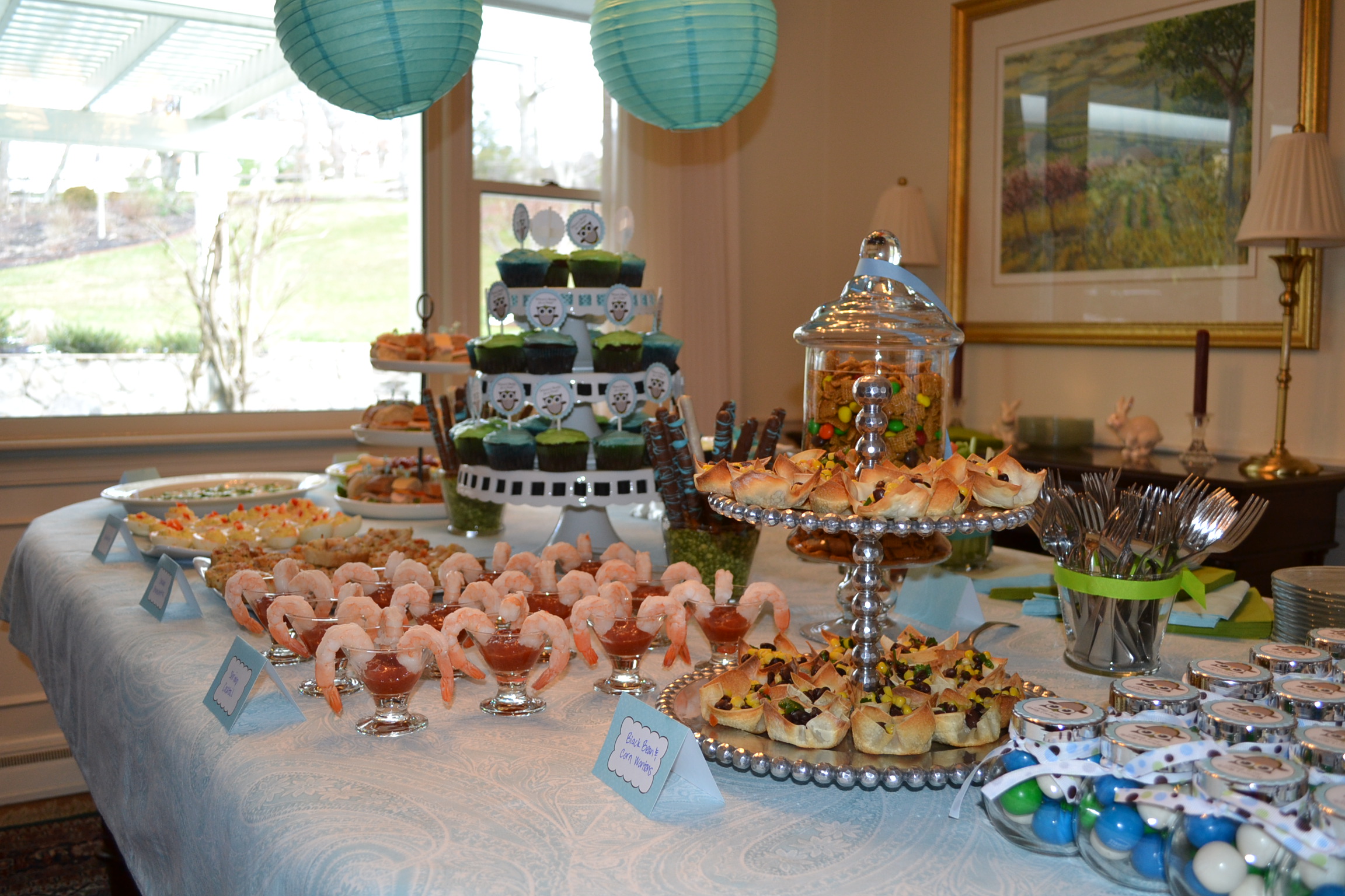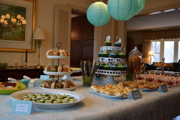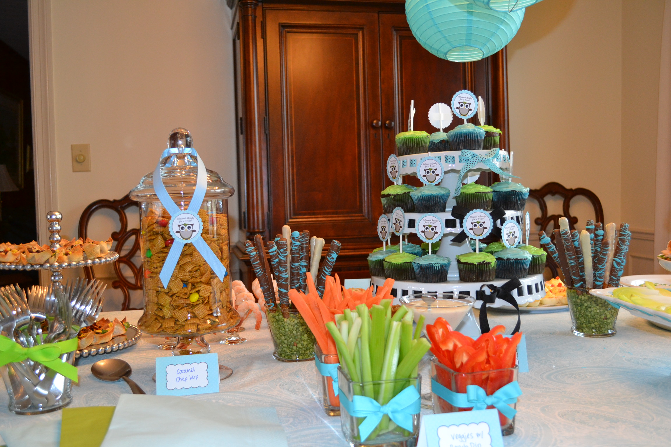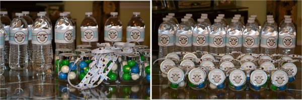 No, I’m not pregnant, but my good friend Amy is! This past weekend I hosted a baby shower for the mommy to be. Amy is about 4 weeks away from having a little boy, so I put together the most elegant baby shower I could. While perusing the internet, I found some really cute blue and green owl themed party printables on Etsy. Printables are a really cool way to add personalization to any party. You buy the design from a graphic artist and cut the labels, creating a DIY a themed party! I purchased some 2″ favor tags, water bottle labels, and tented table cards.